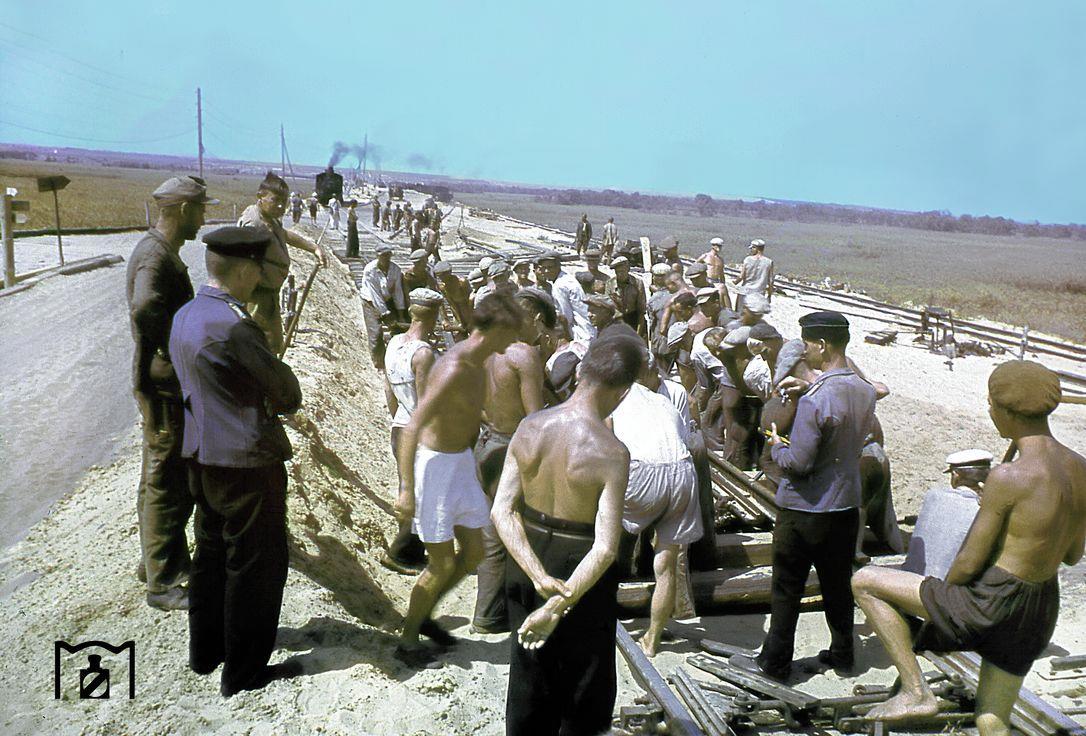 Железнодорожные работы на участке Алешки - Паромная переправа Алешки. На переднем плане под руководством двух "железнодорожников в синем" будет проложен новый стрелочный перевод. Полевой железнодорожный путь, расположенный справа, ведет к строящемуся болотному мосту, который является частью гигантского железнодорожного моста через дельту Днепра. Вид открывается на северо-запад в сторону Днепра / Херсона. (07.1943) Foto: Walter Hollnagel