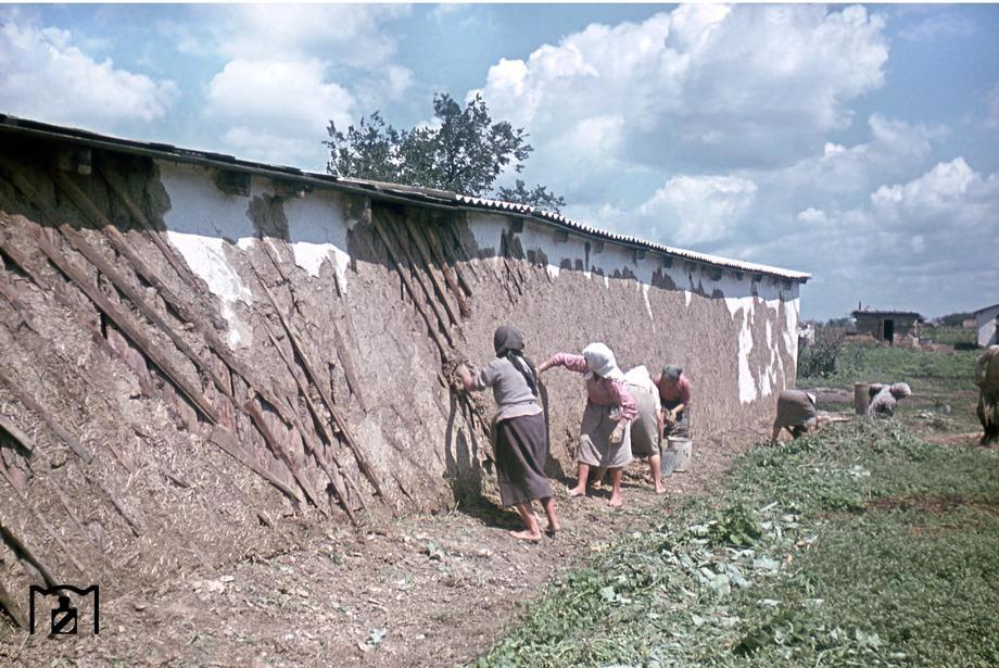 В дополнение к своей официальной деятельности, Уолтер Холлнагель всегда очаровался землей и ее народом. Таким образом, он запечатлел этих украинских женщин с соломенной и глиняной смесью на картинке, намазывающих деревенские дома. (07.1943) Foto: Walter Hollnagel