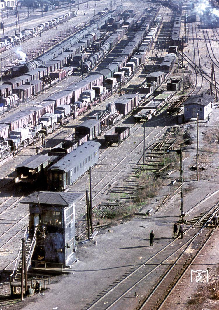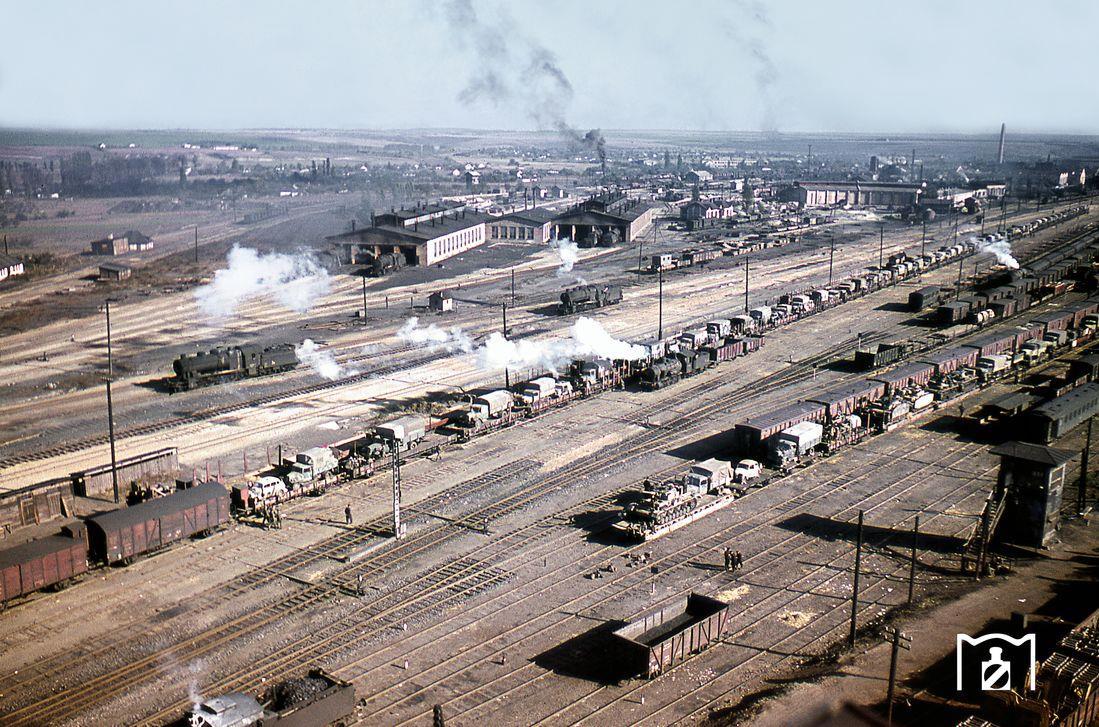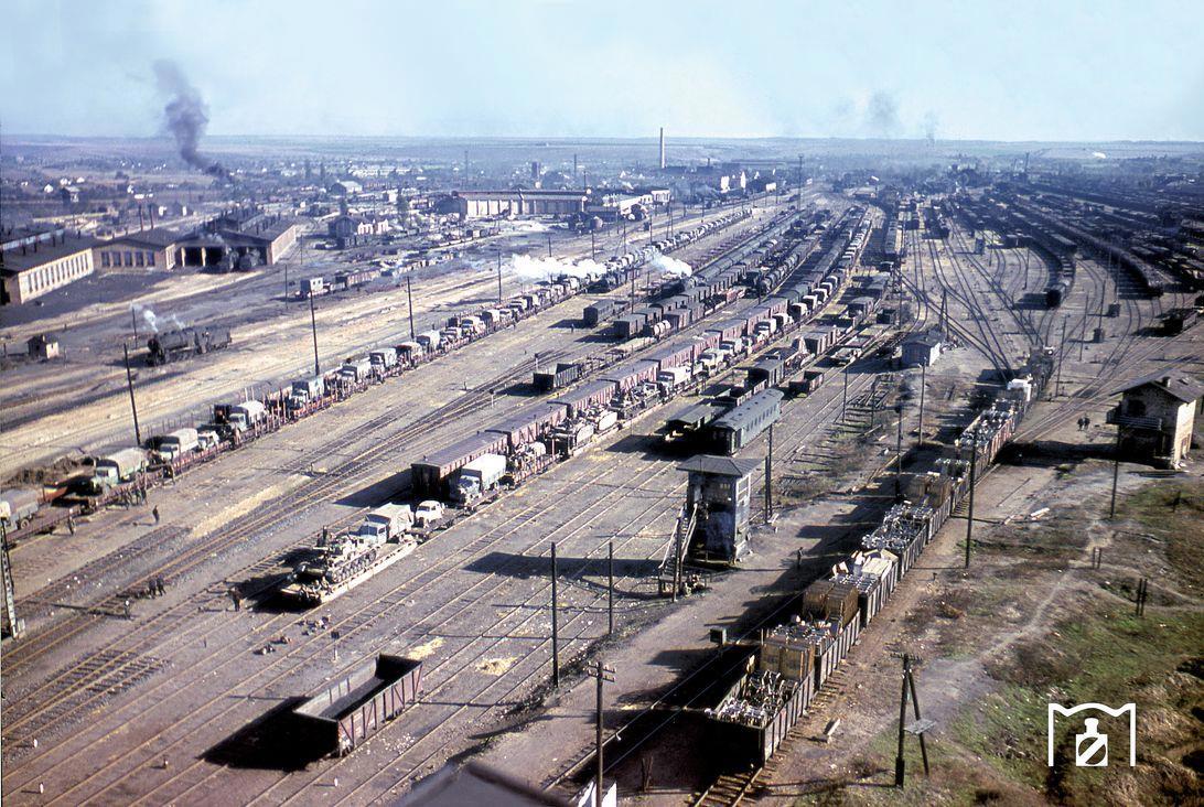 На этом панорамном снимке запечатлен железнодорожный узел Бобринская в направлении на северо-восток. На переднем плане находятся железнодорожные пути в средней части вокзала, где находится прусский паровоз G 71 (серия 55.0) с маневровым отделением. Кроме того, видны обширные установки станции. Слева находятся два недавно построенных прямоугольных локомотивных депо, каждое на 12 локомотивов Работы на новом кольцевом локомотивном депо все еще продолжаются. Однако отсутствующий поворотный круг так и не был установлен, а десять подъездных путей до сих пор соединены стрелочной дорогой. На самом верху, в северной части вокзала (над правым прямоугольным навесом), дымит локомотив перед поездом, идущим в направлении Черкасс. На станции заметно много локомотивов польской серии Ty23 (BR 58.23). Весной 1943 года в Bw было еще около 50 локомотивов этой серии, которые постепенно были заменены новыми локомотивами серии 52. (05.1943) Foto: Walter Hollnagel