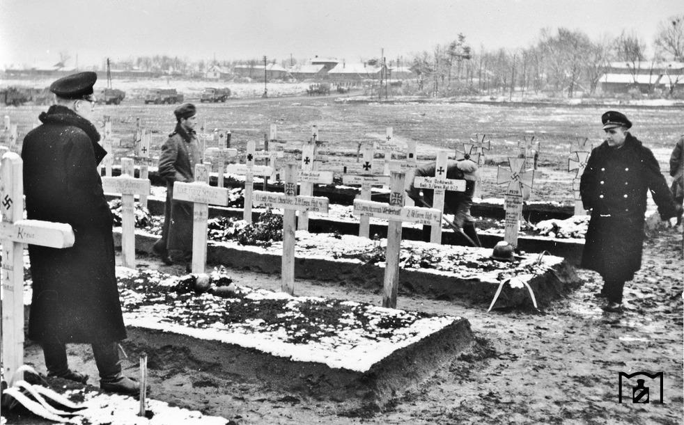 Пока неумолимо продолжается отступление по дороге из Кременчуга в Кировоград, члены Рейхсбана под Александрией на Украине, вероятно, в последний раз посещают могилы своих павших товарищей. Только с ноября 1942 года по март 1943 года на Восточном фронте погибло 850 тысяч немецких солдат. Красная Армия сравняла такие кладбища с землей, когда отвоевала их. (11.1943) Foto: Walter Hollnagel