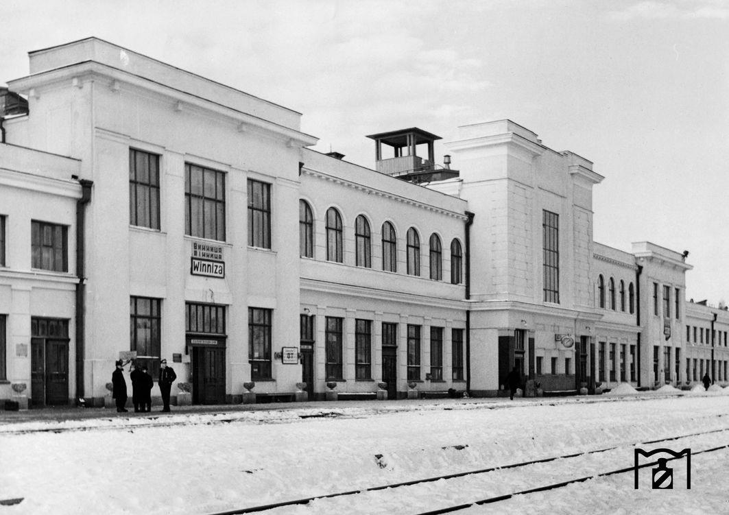 Винница, крупный город и административный центр, находится на магистрали (Киев-) Казатин-Жмеринка (-Одесса). Здание вокзала, соответствующее значению города, было построено в 1920-х годах в стиле конструктивизма. Интересным является то, что название станции написано сразу на трех языках. Табличка с кириллическими буквами вверху обозначает "Винница" (русская), внизу - "Винница" (украинская). Табличка с ныне действующим немецким названием "Винница" была впоследствии установлена немецкими оккупантами в 1941 году. В административном отношении в Виннице существовало Управление эксплуатации железных дорог (EBD), которое подчинялось Южному железнодорожному управлению в Киеве. 20 марта 1944 года город был отбит Красной Армией. В результате боевых действий здание вокзала было значительно разрушено. Он был украшен современной послевоенной архитектурой и перестроен заново. (1942) Foto: RVM (Schuster)
