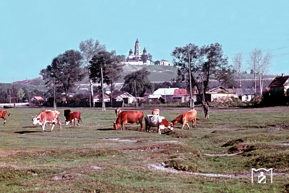 (Обманчивая) идиллия на фоне Крестовоздвиженского монастыря под Полтавой. По высокой дамбе в центре кадра проходит железная дорога Полтава-Киев (налево). Весной 1942 года пастбища все еще были затоплены паводковыми водами Ворсклы. Монастырь, построенный в 1650 году на холме недалеко от реки Ворсклы, считается одним из лучших образцов архитектуры украинского барокко. В Полтаве, которая с 19 сентября 1941 г. находилась под немецкой оккупацией (Рейхскомиссариат Украина), в 1942 г. здесь находился штаб немецкой группы армий "Юг", которая должна была захватить Сталинград и Кавказский регион. Почти через полтора года после этого снимка, 23 сентября 1943 года, Красная Армия вновь заняла Полтаву во время битвы на Днепре. (1943) Foto: Walter Hollnagel