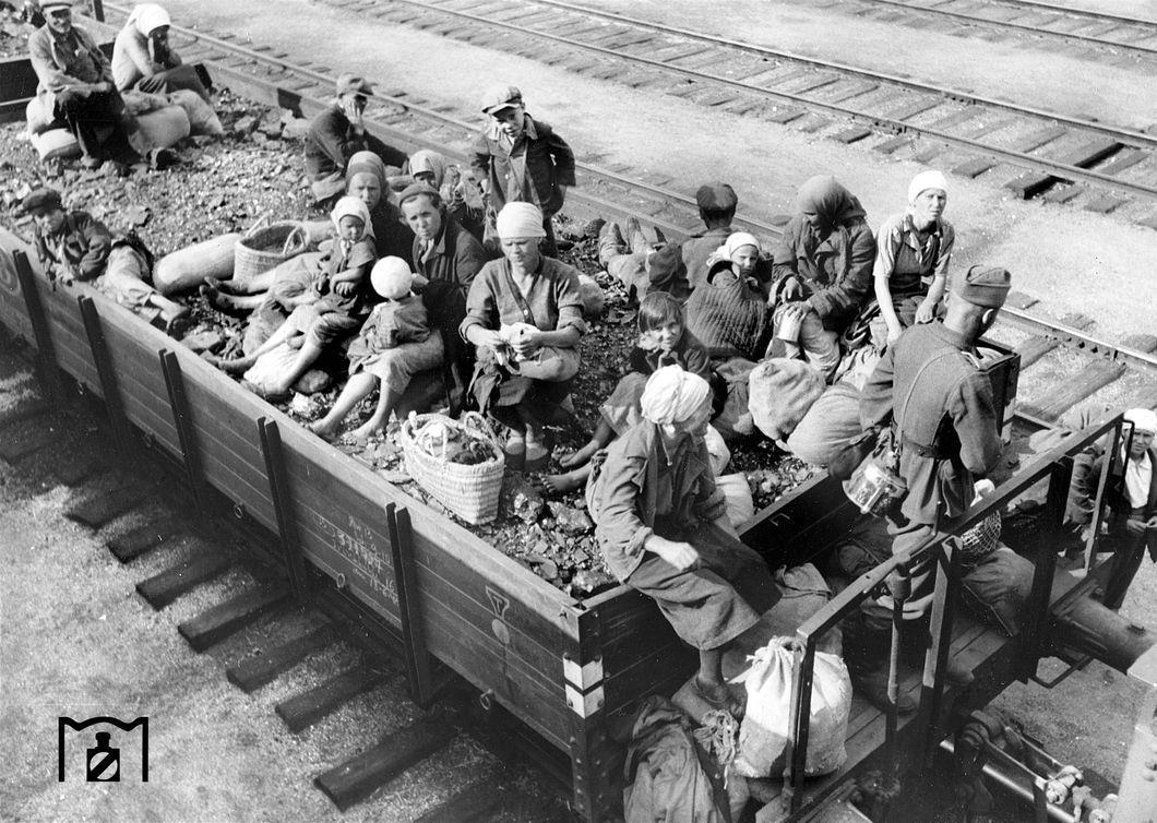 Вот как выглядели путешествия украинцев во время немецкой оккупации: проезд предоставлялся в товарных поездах, а проезд в пассажирских поездах предназначался исключительно для вермахта и немцев. Характерно также, что население теперь состоит только из женщин, детей и стариков, которые, очевидно, пришли с рынка и теперь хотят вернуться домой. Они разместились на смеси крупного и мелкого угля в груженом грузовом вагоне, который, согласно маркировке собственности, был отправлен бельгийскими государственными железными дорогами на Восточный фронт.(1943) Foto: RVM (Hollnagel)