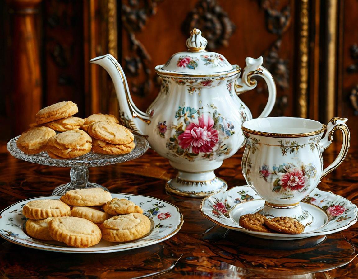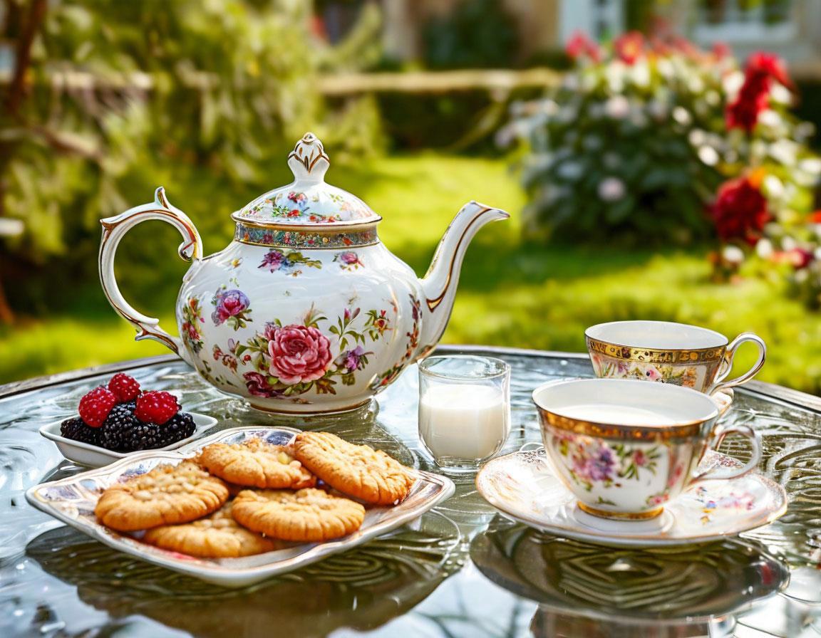Слуги быстро сервировали стол. В центре стоял изящный фарфоровый чайник с нежным цветочным узором. Чай, ароматный и крепкий, был заведен из лучших сортов — черного и зеленого, что привозили из далеких стран. Рядом с чайником располагалась маленькая сахарница и керамическая чашка с свежим молоком, чтобы каждый мог подстроить вкус под себя.