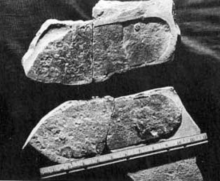1863 год,Франция.Найдена ископаемая кость носорога на которой имеются следы обработки каменными орудиями первобытных людей,возраст от миллиона до полутора миллионов.