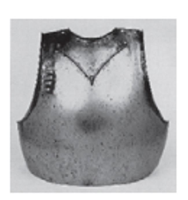 Первый нагрудник имеет значительную выпуклость, он прикрывает туловище спереди и с боков, его нижний край, доходящий до талии, ровный. Панцирь имеет подкладку из кожи буйвола и состоит из девяти вертикальных полос, самая крупная расположена в центре, остальные уменьшаются по мере удаления от нее. На теле он удерживается при помощи ремней.