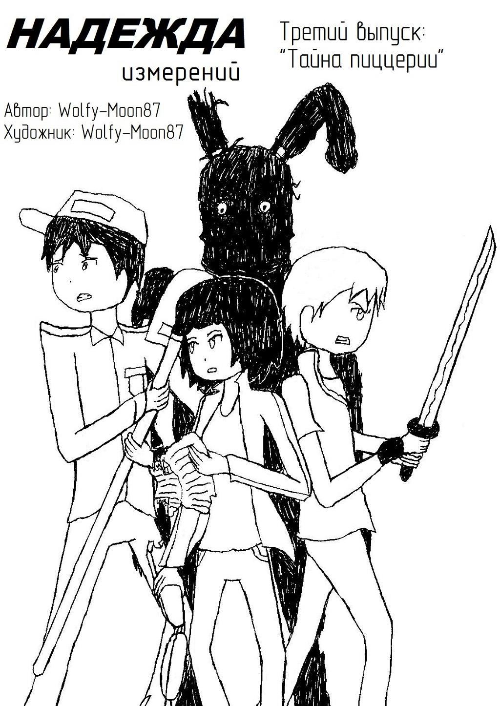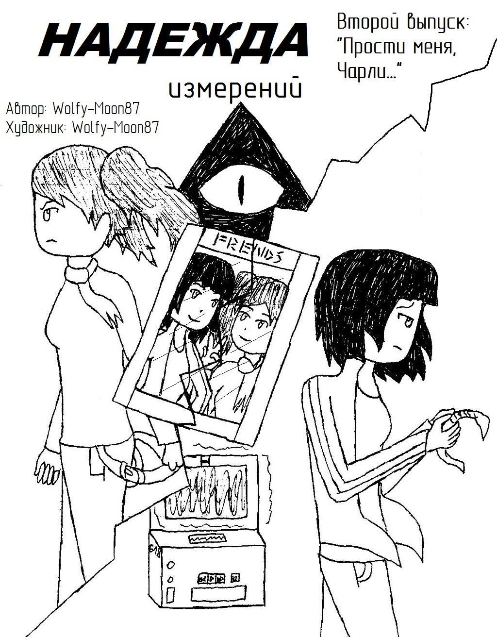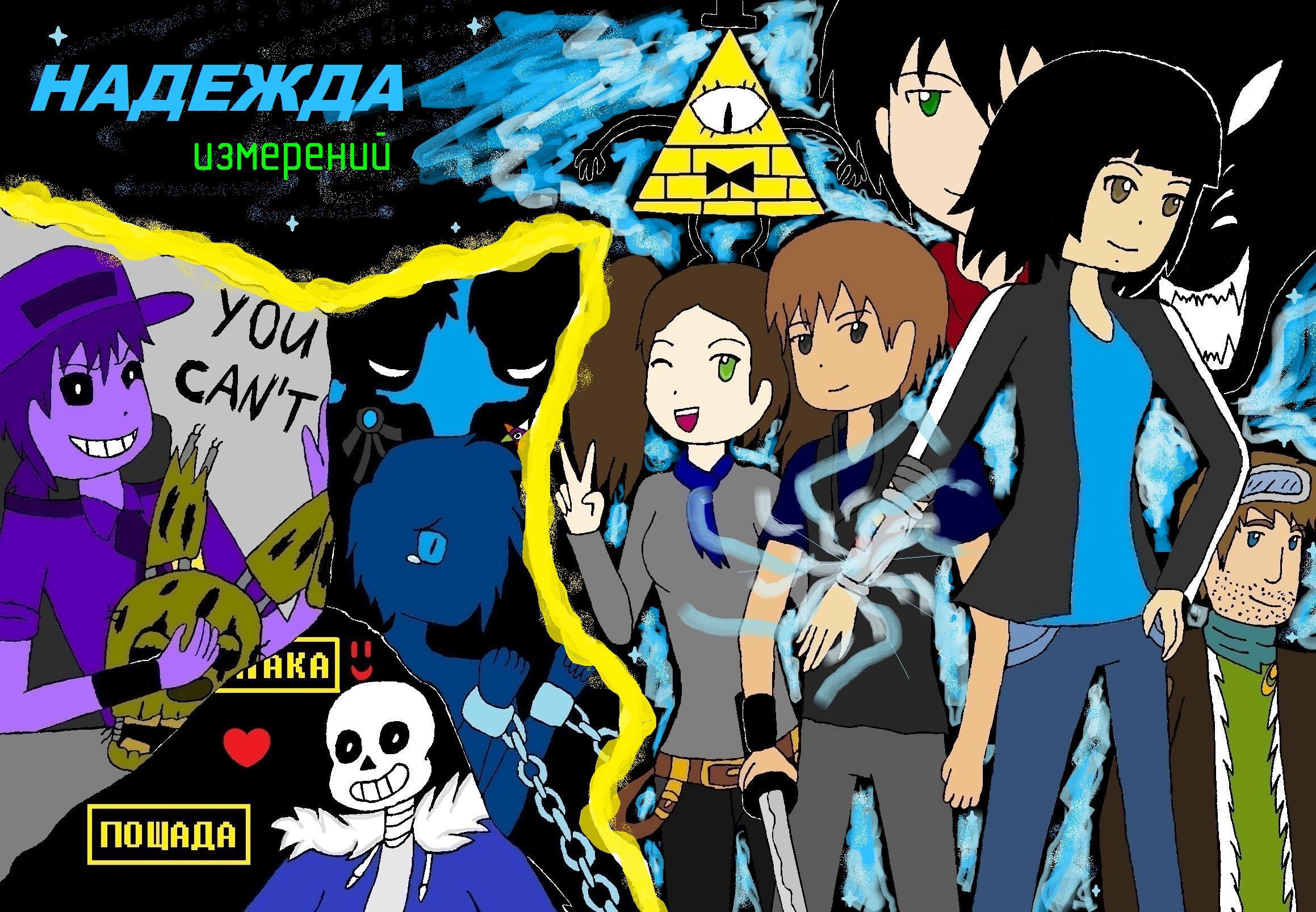 Раньше, когда мне было 15 лет, мой роман имел облик комикса, который рисовала я сама в тетрадках синей ручкой. Персонажи были те же, но большую часть занимали фандомы: Гравити Фолз, ФНАФ 3, Андертейл, Реверс Фолз и т. д. Всё верно, "Надежда измерений" был фанфиком с моими оригинальными персонажами. Вот изображение якобы постера к комиксу. На постере вы можете лицезреть уже знакомых моих персонажей: Умари Коннорс, Джейкоб Дэвис, Чарли Белл, Нэйтон Дэвис и Тёмный Волк (который раньше назывался "Ночным Волком").