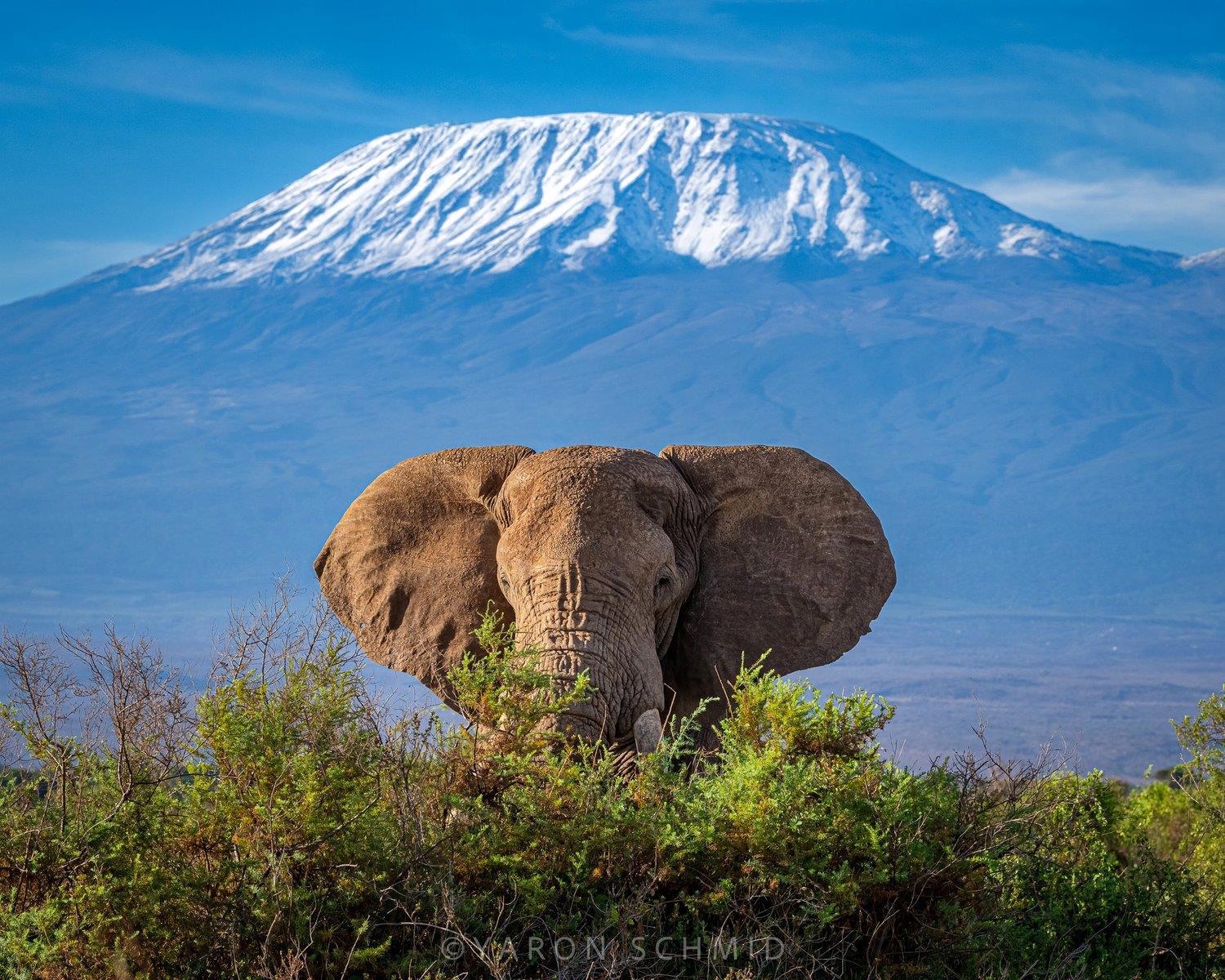 Два гиганта Африки : Слон и гора Килиманджаро.