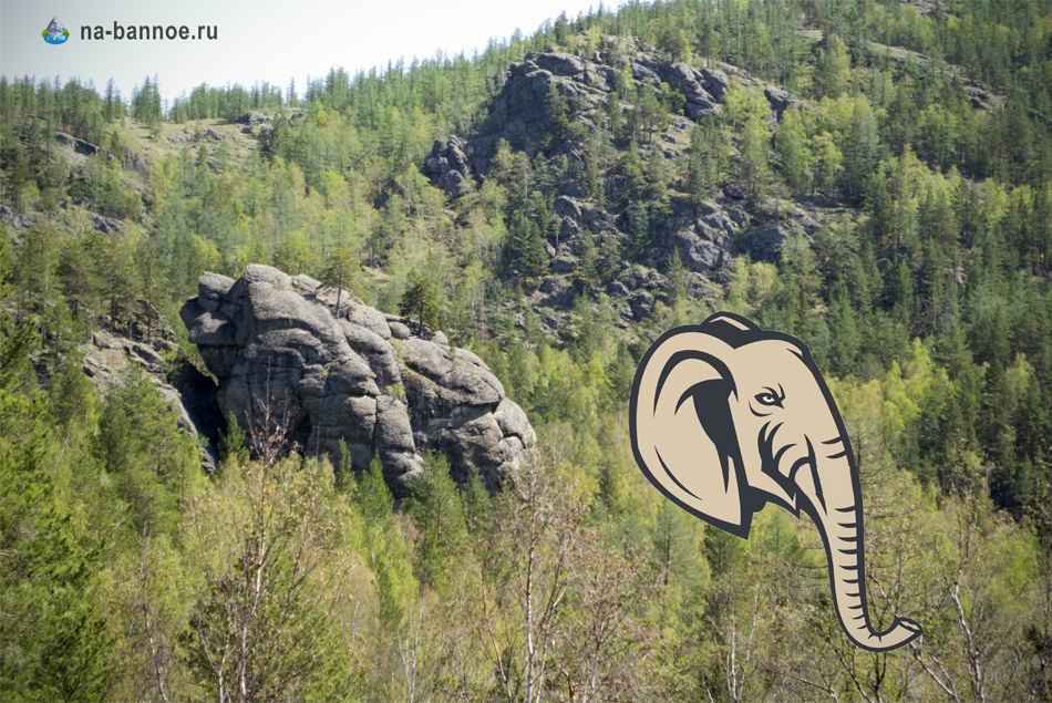 Банное — скала СлонСкала Слон (её так же называют Торнаташ, Слоник, Слоники, Слоновий лоб) пользуется популярностью на протяжении многих десятков лет у альпинистов, скалолазов и туристов, это отличное место для ПВД — похода выходного дня. Скала имеет такое название потому, что в определённых ракурсах напоминает голову слона, особенно примечательно то, что голову слона она напоминает с обеих сторон (т.е. голова почти симметричная) и со стороны водопада Марьины слезы, и со стороны ГЛЦ Банное. Располагается вблизи горнолыжного центра «Банное» на склоне горного массива «Хребет Крыктытау» и достигает в высоту 15-17 метров. На скале слон в скальной породе выбит древний петроглиф.