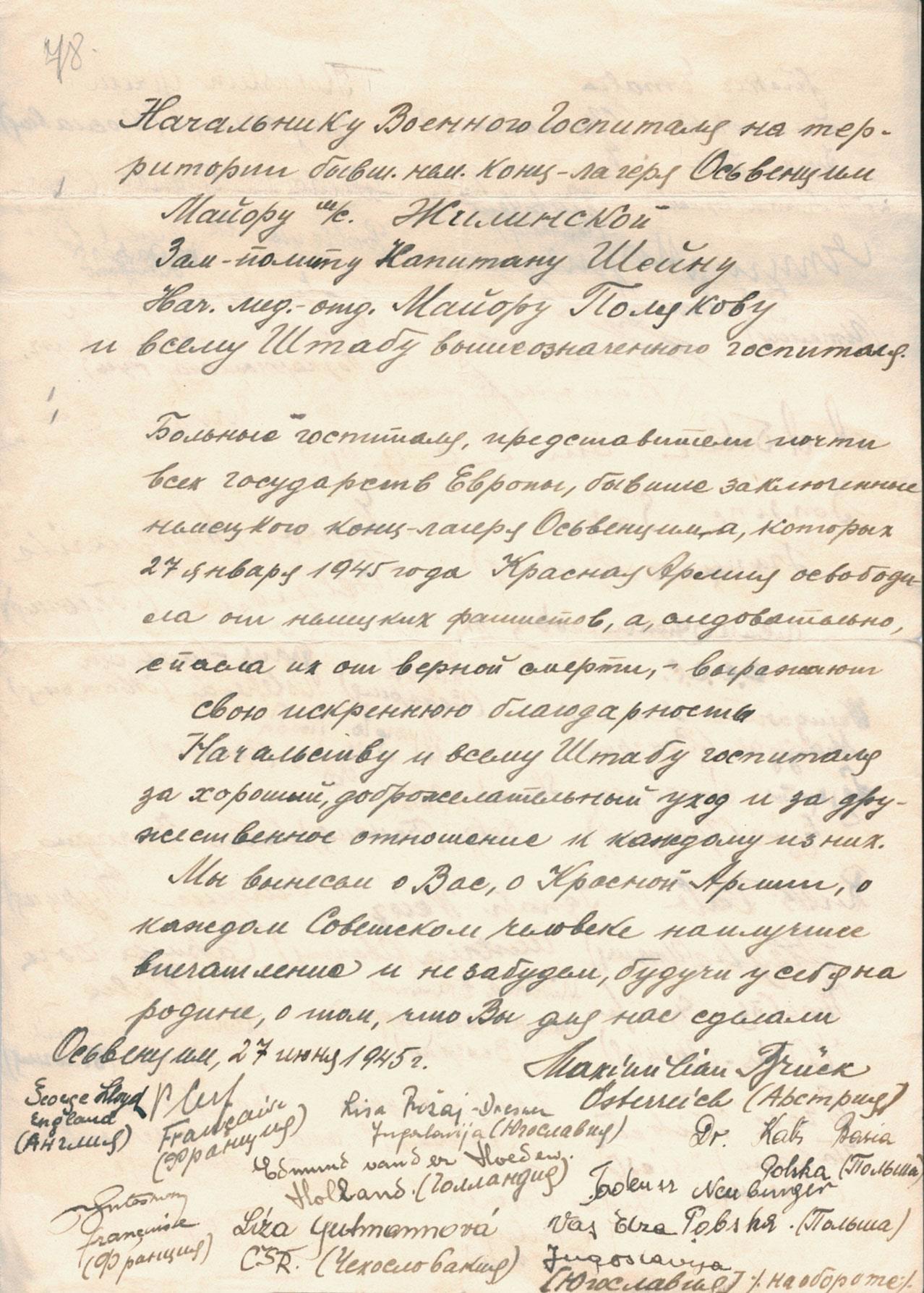 Благодарность майору медицинской службы Маргарите Жилинской и её коллегам — сотрудникам военного госпиталя от бывших узников Аушвица. 27 июня 1945 года.