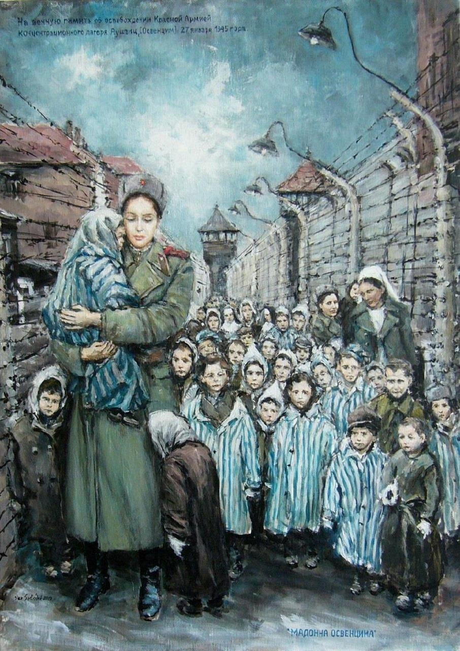 Эту картину, "Мадонна Освенцима", написал в 2021-м году чешский юрист, преподаватель и художник Станислав Седлачек. 27 января 1945-го года после ожесточенных боёв части 28-го корпуса 60-й армии 1-го Украинского фронта, как это принято у нас писать, освободили город Аушвиц и район вокруг него. Вот в этом районе подразделения сотой, триста двадцать второй и сто седьмой стрелковых дивизий освободили узников комплекса, состоящего из нескольких лагерей, под общим названием Аушвиц: собственно Аушвиц, Аушвиц II/Биркенау, Аушвиц III/Моновицы . Последний являлся комплексом из около 40 трудовых лагерей, разбросаных вокруг шахт иьпредприятий. В СССР, а первые несколько лет и в Польше эти лагеря называли по польскому имени города - Освенцим. Самый страшный лагерь, лагерь уеичтожения Аушвиц-Биркенау (Освенцим-Бжезинка) был заминирован и саперы 107-й дивизии поработали, перед тем как туда вошли части дивизии. О том, что творилось в лагерях, известно достаточно хорошо, описывать это не стану здесь. Привлеку немного внимания к другому.Были там и дети. Вот только они приходили в ужас при виде мужчин в военной форме и с оружием. Тогда командование отправило в детские бараки женщин-военнослужащих . Они-то и выводили детей, которых медики осматривали и отправляли для осмотра медикаи частей и инфеционного госпиталя 60-й армии. От белых халатов дети тоже приходили в ужас, женщины-военнослужащие их успкаивали, как могли, хотя это часто и не удавалось. Дети-заключенные хорошо знали, что люди в белых халатах будут в лучшем случае брать у них кровь... Сразу после освобождения в Освенциме разместили терапевтический полевой госпиталь, которым руководила военврач майор медицинской службы Маргарита Владимировна Жилинская, хорошо знавшая, что такое дистрофия и нервное истощение - она создавала стационары в блокадном и постблокадном Ленинграде.