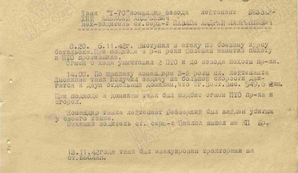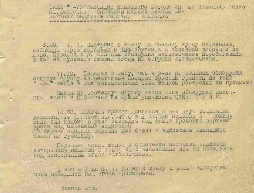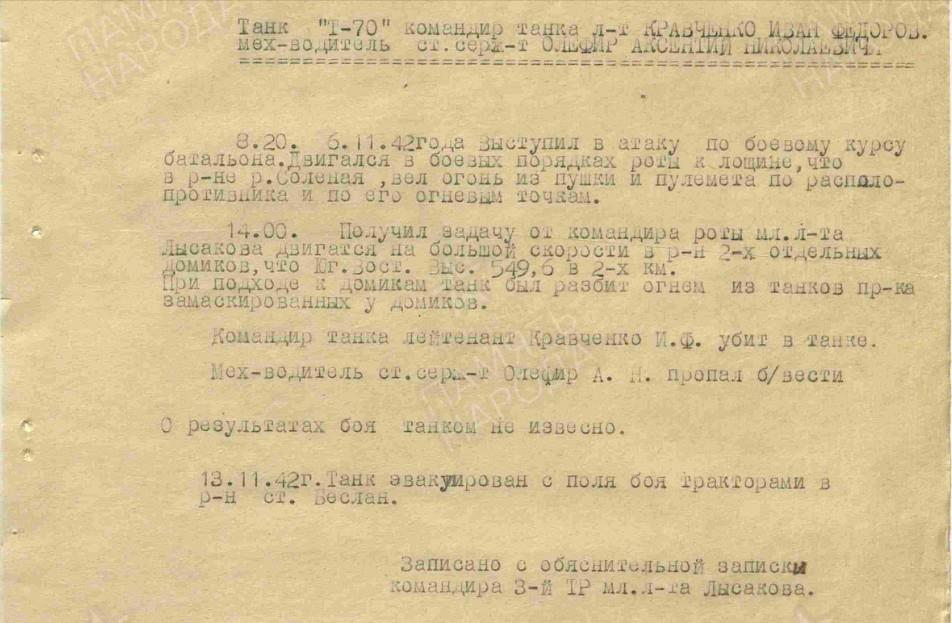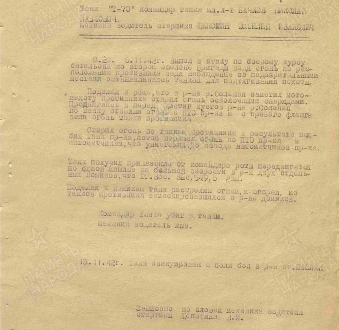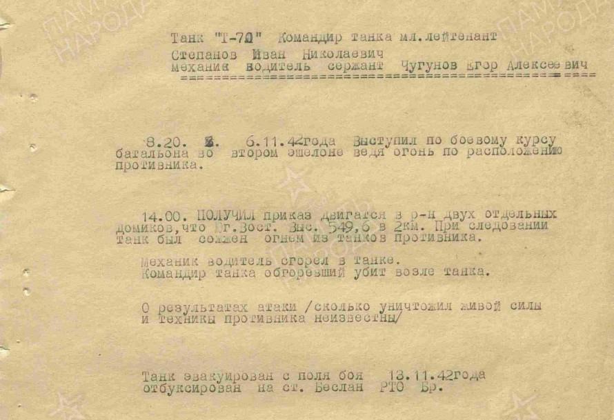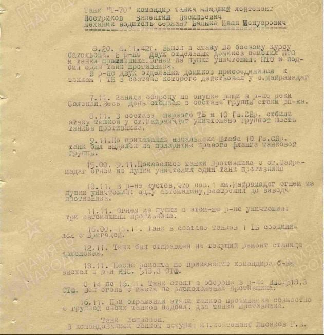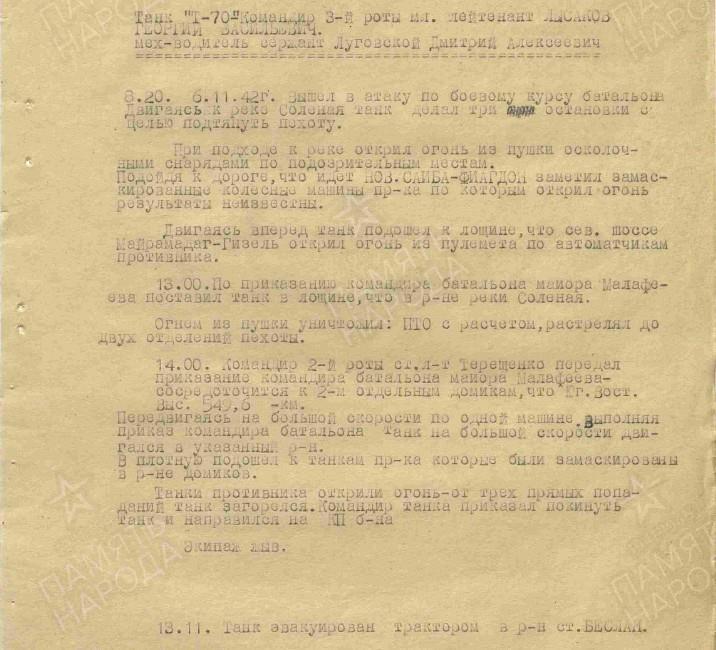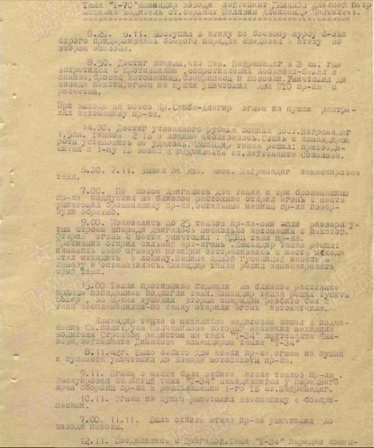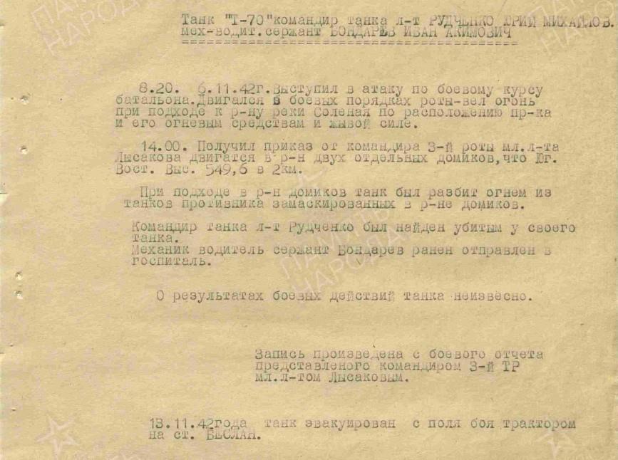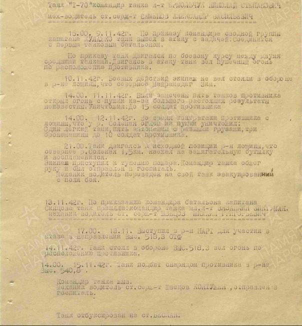 В продолжении темы о лёгких танках Т-70 в бою, в отчёте говорится про судьбу каждого экипажа и каждого танка, пошедшего в бой 6 ноября 1942 года, а также о продолжении боевых действий.