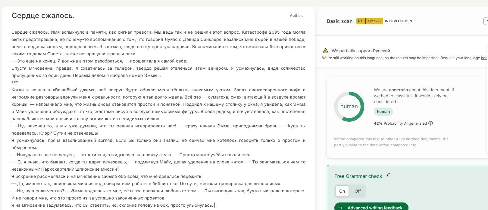 Как ни старался, больше 50% генерации ИИ мне получить не удалось) Мне кажется, что это хорошо
