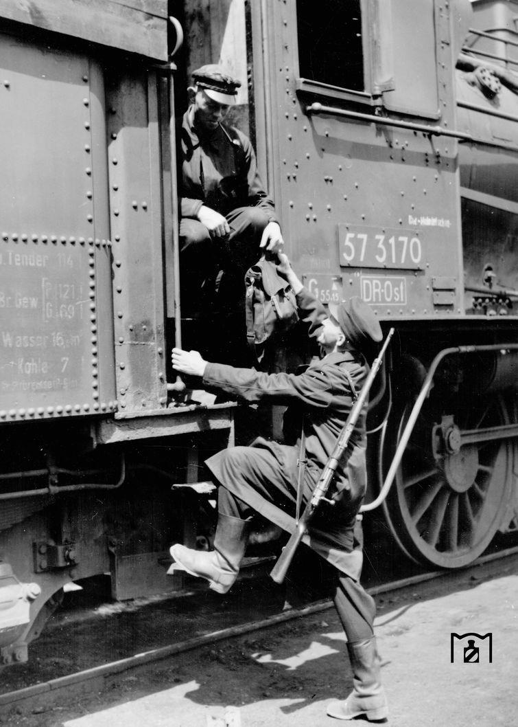 Машинист садится в паровоз на станции Молодечно, на железнодорожной линии Вильно - Минск - Гомель. Вооружение машиниста не является чем-то необычным, им приходилось постоянно ожидать партизанских налетов. 1942) Foto: RVM (Below)