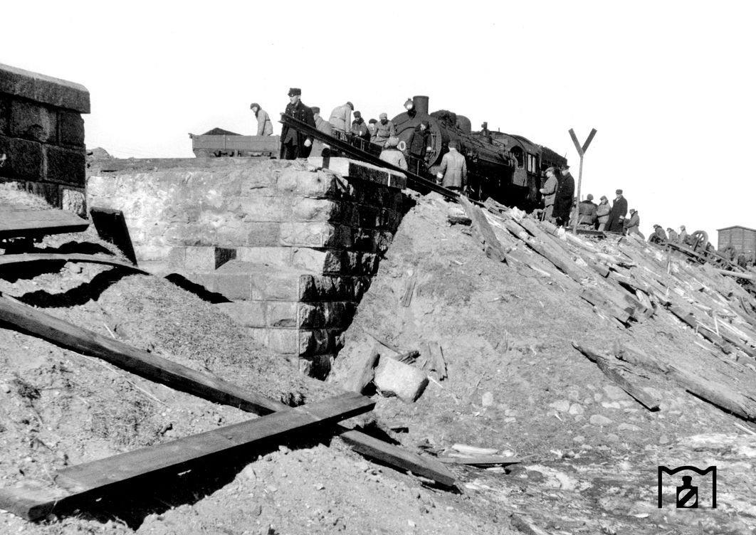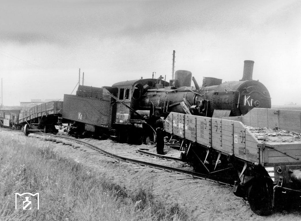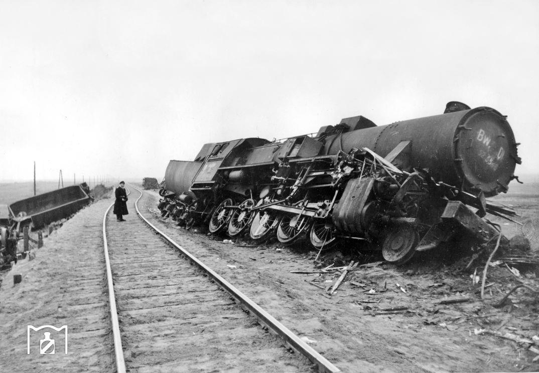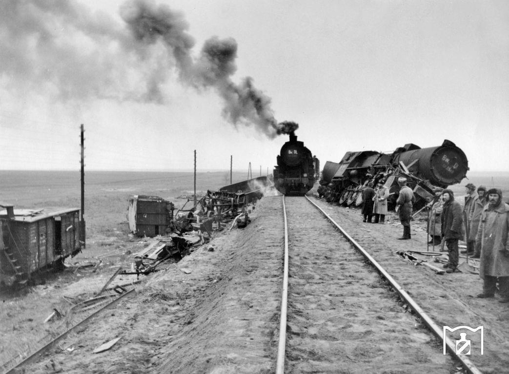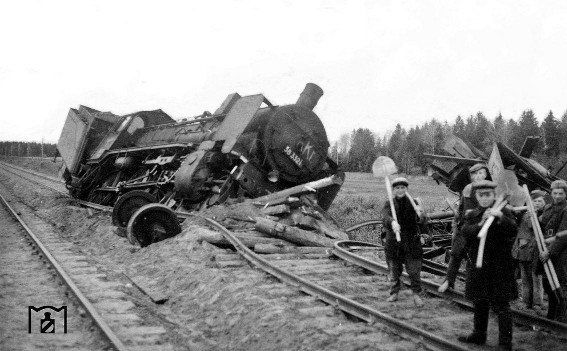 Партизаны выполнили всю работу: 52 5548 из Долинской сошли со своими вагонами в Шаровке на линии Знаменка - Долинская. Трасса уже восстановлена в почти неизменном виде. Сошедшие с рельсов вагоны были просто опрокинуты с насыпи. (10.1943 г.)??? Foto: Walter Hollnagel