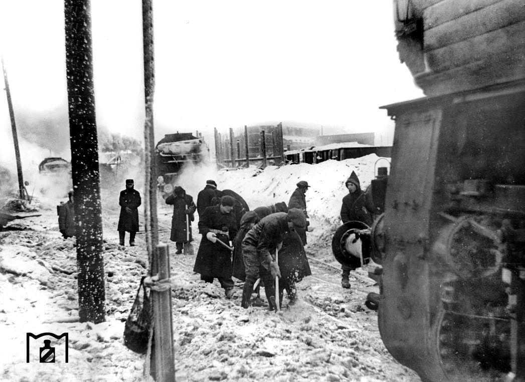 Расчистка от снега и наледи на железнодорожном заводе Смоленск-Восточный. В оригинальном тексте фотографии цензуре подверглось замечание о том, что из-за близости русского фронта местные не осмеливались работать на немецкую администрацию. Таким образом, на данный момент солдаты армии сражаются со снегом, а не с большевизмом. Очевидно, что зимой 1941/42 года к востоку от Смоленска все еще шла ширококолейная эксплуатация. (02.1942 г.) Foto: RVM (Donath)