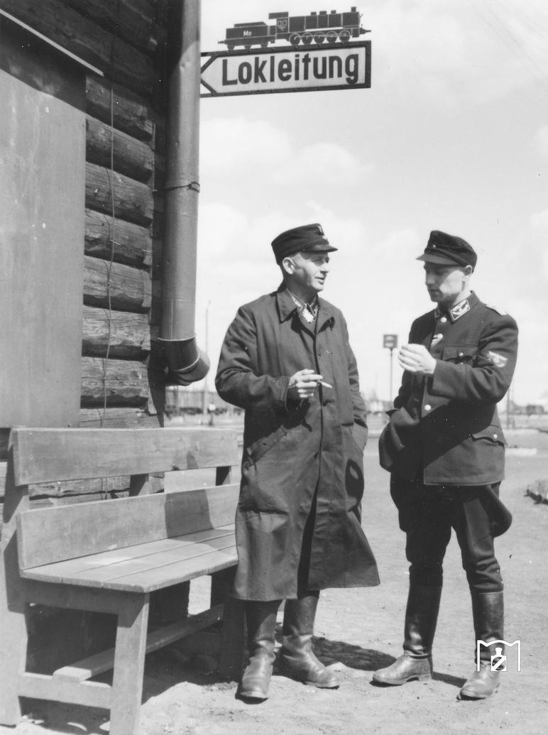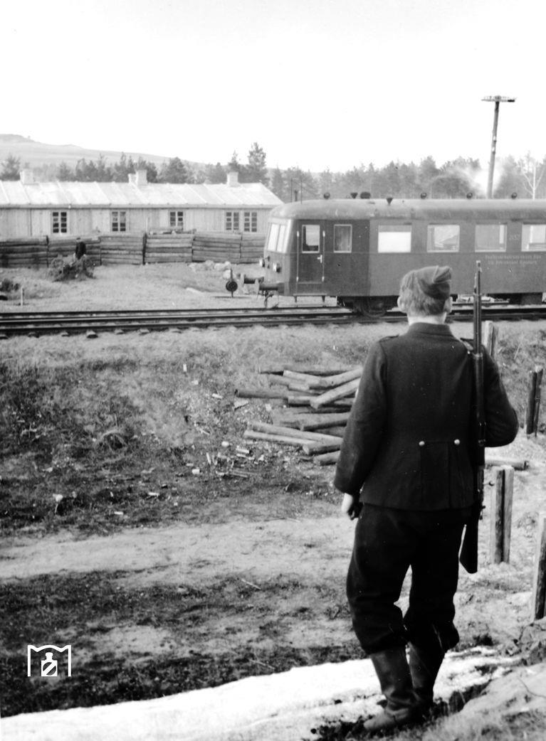 Угроза нападения партизан на оккупированные немцами территории России привела к необходимости принятия обширных мер безопасности, о чем свидетельствует огражденная частоколом пристройка перед служебным бараком, мимо которого в данный момент проезжает неизвестный железнодорожный вагон. Возможно, двухосный вагон стандартной колеи мог быть транспортным средством Литовских государственных железных дорог. Визуально VT имеет сходство с вагоном Uerdinger Triebwagen производства LBE (1943 г.). Foto: RVM (Korte)