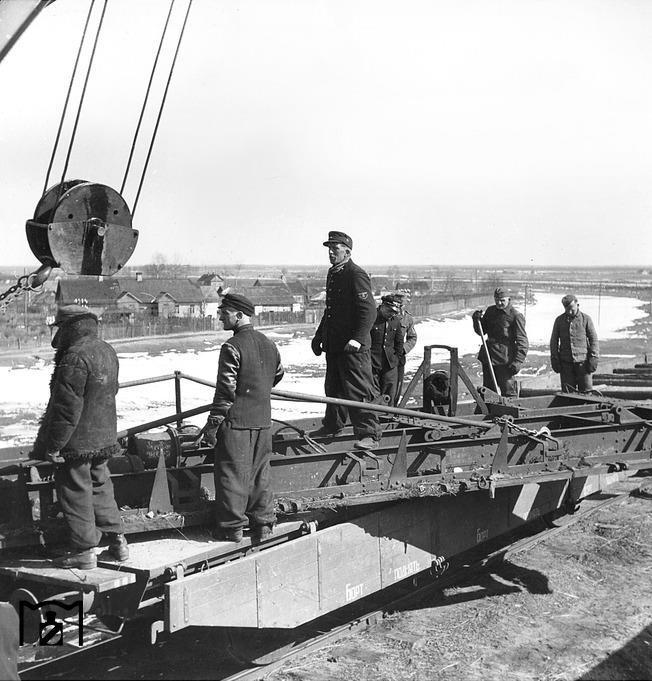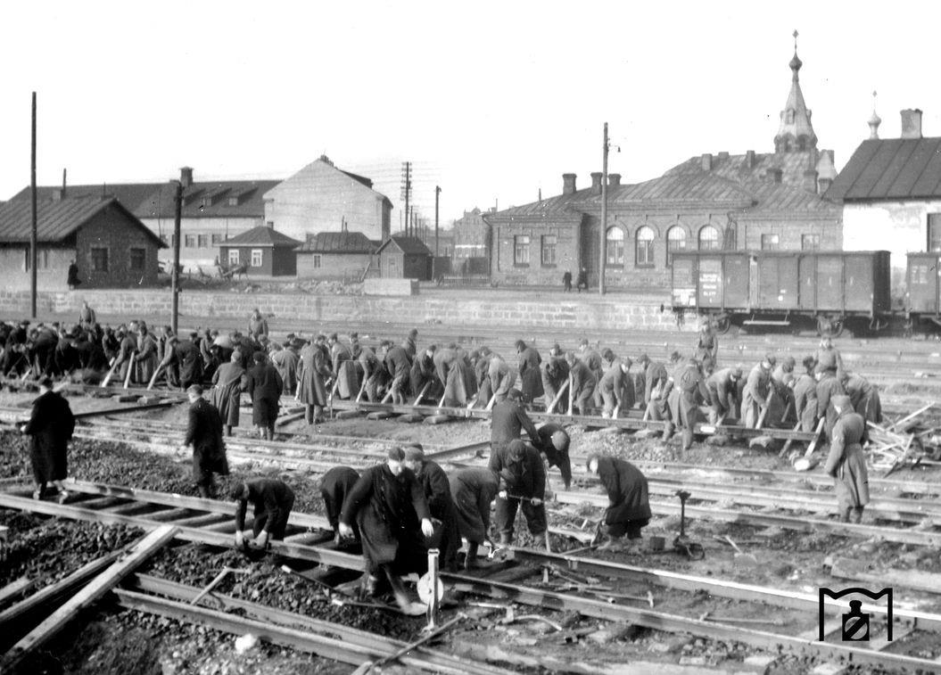 С помощью масс советских военнопленных перешивка производится вручную. На всех снимках такого рода никогда не изображена тяжелая техника в виде гусеничных машин, кранов или экскаваторов на оккупированных восточных территориях. Термин "трудовое уничтожение", цинично используемый национал-социалистами, применялся не только к системе концентрационных лагерей, но и намеренно одобрялся, особенно в отношении подневольных рабочих и русских военнопленных из-за чрезмерного тяжелого труда и недостаточного снабжения. (1942) Foto: RVM (Korte)