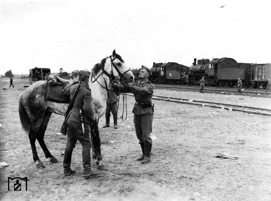 Во время 2-й мировой войны на стороне Германии было задействовано 2 800 000 лошадей. Согласно данным Генерального штаба сухопутных войск о потерях в лошадях в полевых войсках за период с 22 июня 1941 года по 31 декабря 1944 года, среднемесячная общая потеря лошадей обычно составляла около 30 000, из которых более 90% приходилось на Восточный фронт. Таким образом, продолжительность жизни этой лошади в Минске, вероятно, была довольно скромной. Необычной особенностью этого снимка является также маркировка захваченных российских локомотивов свастикой. (1942 г.) Foto: RVM (Ittenbach)