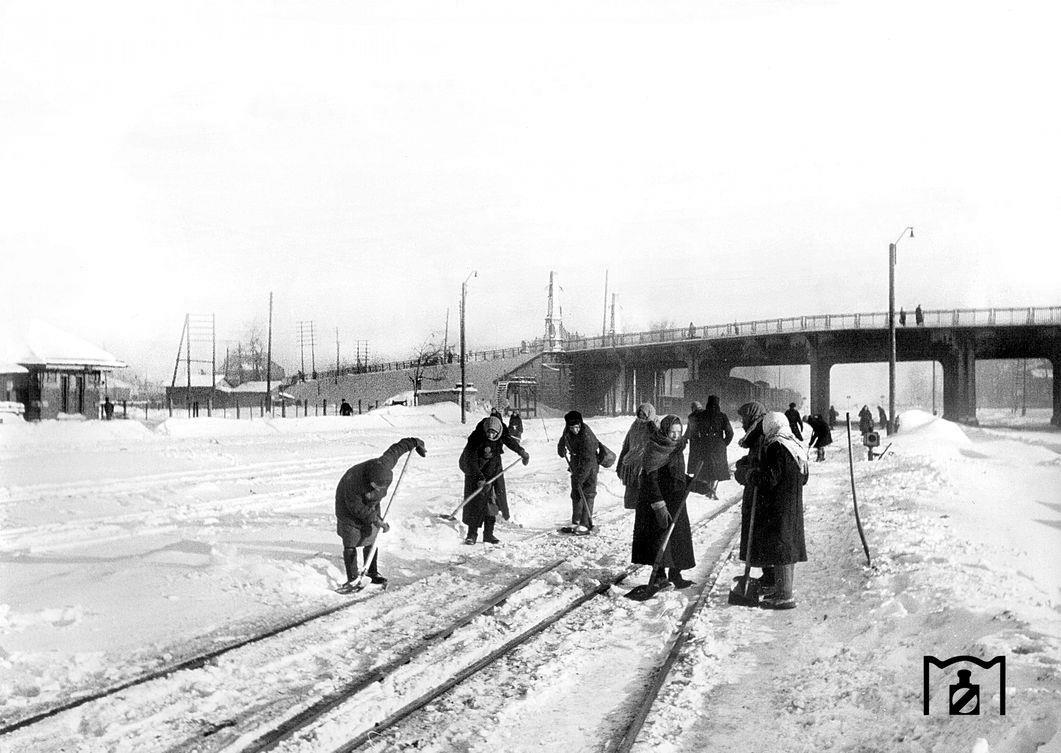 Служащие местные мужчины и женщины пытаются очистить от снега стрелочный перевод на Минском вокзале. (1942) Foto: RVM (Bandelow)