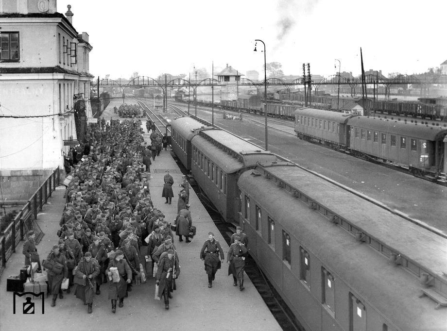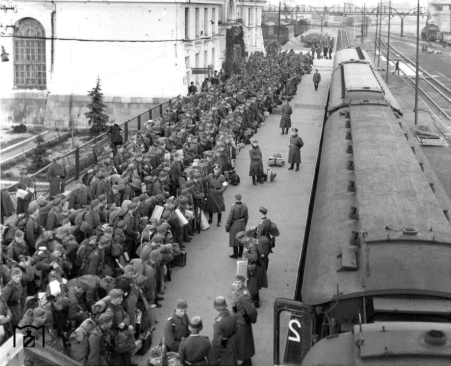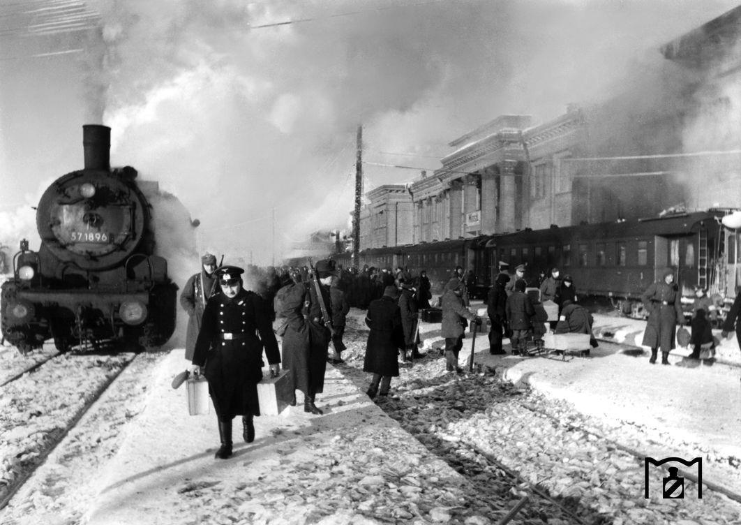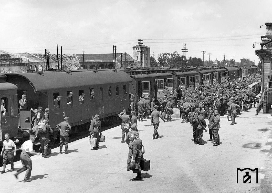 Военнослужащие Вермахта готовятся к отправлению на железнодорожном вокзале Брест-Литовска. Станция была пограничной станцией во время Второй мировой войны между "Генерал-губернаторством" и "Остландом", ныне между Польшей и Белоруссией. Справа стоит старый баварский вагон D-поезда. (1942) Foto: RVM (Ittenbach)