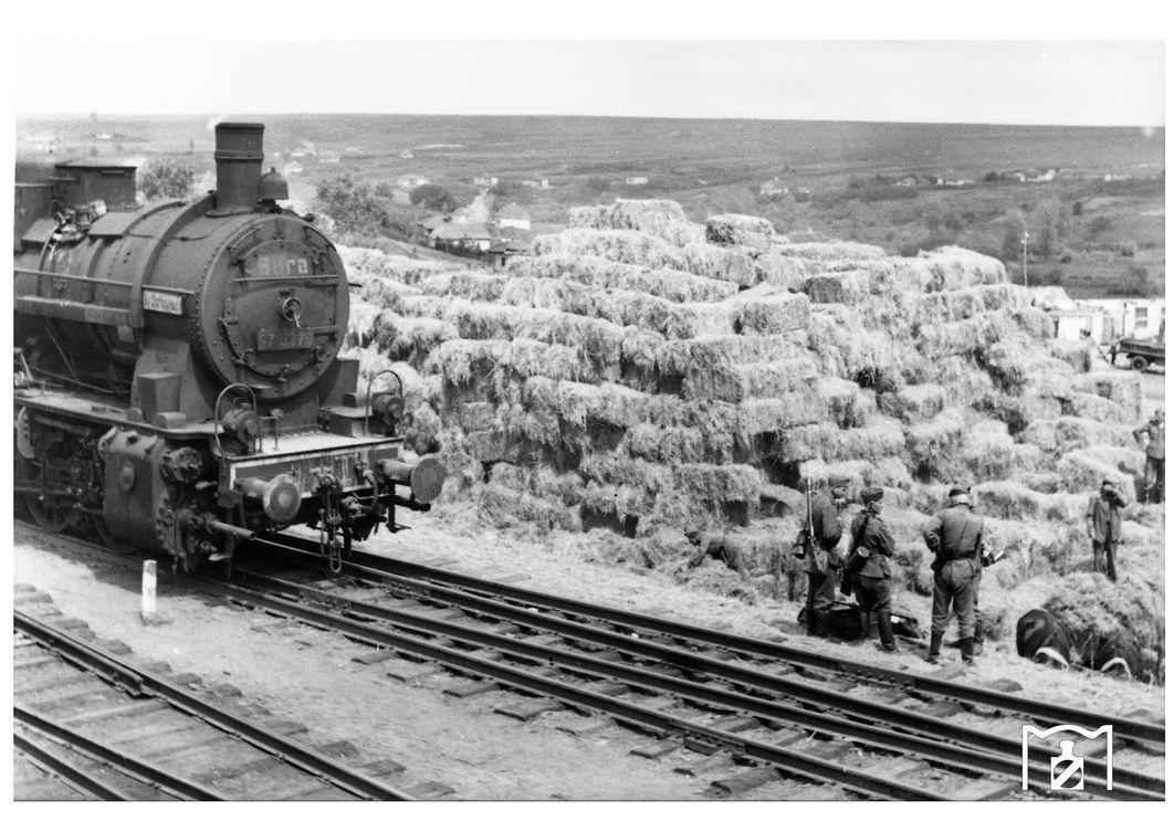 Тюки сена доставляются на неизвестную железнодорожную станцию для погрузки. Трое солдат внимательно следят за происходящим. 57 3279 из станции "Бара" в Барановичах (между Брестом и Минском) был передан в аренду станции "Борисов" (примерно в 80 км к северо-востоку от Минска) на короткий срок, о чем свидетельствует белая табличка на дымовой камере. (1942) Foto: RVM (Ittenbach)