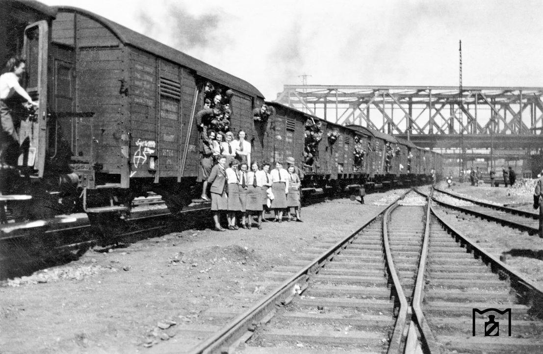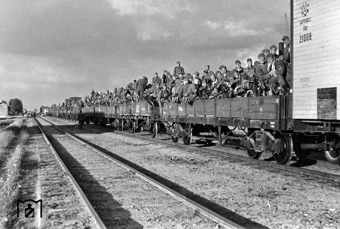 После провала немецкого летнего наступления на Курск в июле 1943 года германский вермахт был вынужден отступить далеко на запад под давлением Красной Армии. Для этого явно использовался весь доступный подвижной состав, в том числе российские ширококолейные открытые вагоны. Всего за два года до этого были вывезены русские военнопленные. По крайней мере, сейчас каждому должно было быть ясно, что фантазии о завоевании закончились навсегда. (1943) Foto: Privatfoto