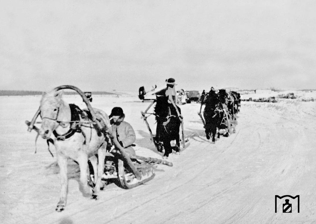 Сани которые во время вторжения германского вермахта в Россию все еще считали средством передвижения русских, служит здесь средством передвижения на аэродроме Дно-Белошкино, транспортном узле на западе России на пересечении железнодорожных линий (Ярославль-) Рыбинск-Бологое-Псков (-Рига) и Санкт–Петербург-Дно.-Невель-Витебск. (1942) Foto: RVM (Donath)