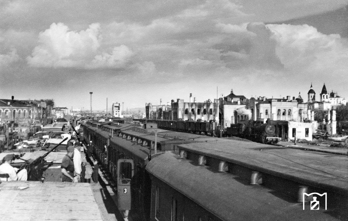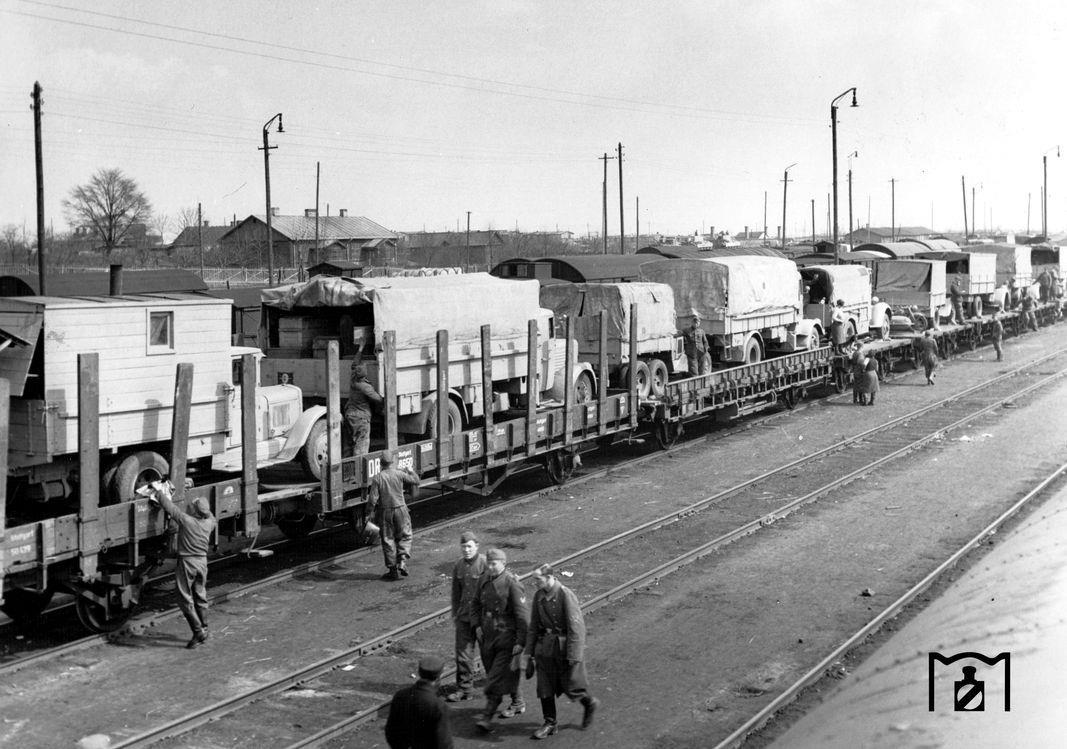Военные поезда на неизвестной железнодорожной станции в Украине. В 1942 году в Полтаве находился штаб немецкой группы армий "Юг", которая должна была захватить Сталинград и Кавказский регион. После поражения в Курской битве (Предприятие Цитадель) в июле 1943 года Верховное командование вермахта планировало создать сильную линию обороны от Балтийского до Черного моря по линии Нарва-Псков-Гомель, чтобы предотвратить продвижение Красной Армии на запад. Немецкая группа армий "Юг" под командованием Эриха фон Манштейна, которая должна была остановить наступление на Украине, насчитывала 1,2 миллиона солдат, 12 600 орудий, 2100 танков и 2100 самолетов. Ей противостояли пять советских фронтов общей численностью 2,6 миллиона солдат, 51 200 орудий, 2400 танков и 2850 самолетов. Итог известен. (04.1943) Foto: RVM