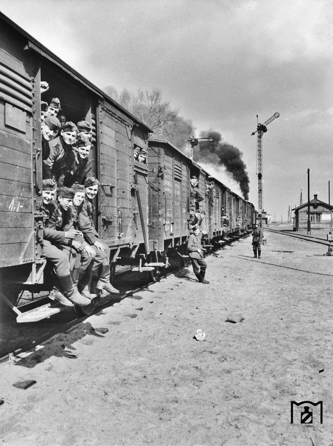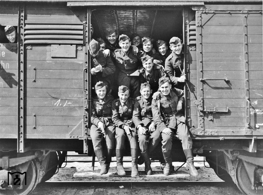 Войсковой транспорт с довольно комфортабельными вагонами на неизвестном железнодорожном вокзале в Украине. Лица солдат, тем не менее, уже не отражают жизнерадостности первых лет войны. На четвертом году войны их настигла реальность. (1943) Foto: Walter Hollnagel