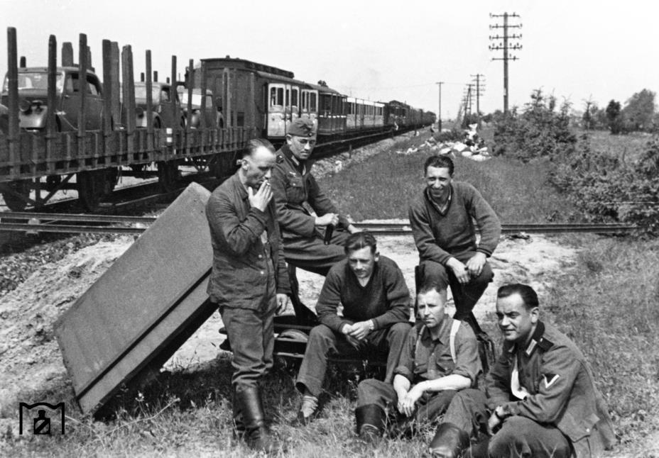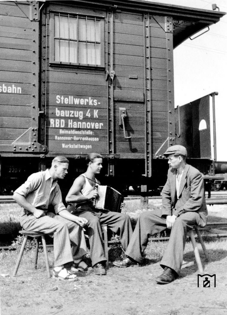Вдали от родины из Ганновер-Херренхаузена в Киеве работал строительный поезд RBD Hannover. Трио, играющее на аккордеоне, вероятно, переместилось для фотографа к вагону-мастерской. Железнодорожным поездам Рейха, направляемым в оккупированные районы, были присвоены номера полевой почты. Поезд 4K по сборке сигнализаторов был приписан к полевой почте № 46 019 как железнодорожный поезд 1303 Ганновер с 12.07.1941 г. по 24.01.1943 г. (1942 г.). Foto: RVM (Bandelow)