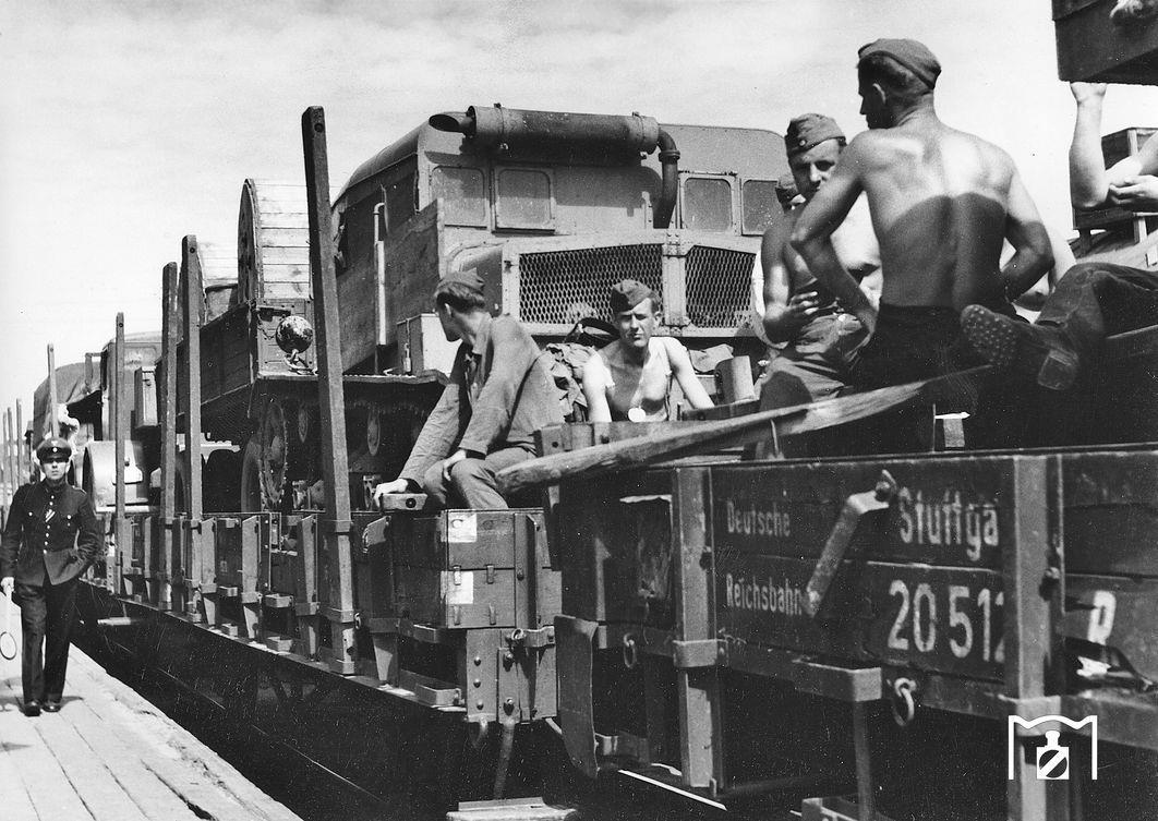 Солдаты сопровождают свои транспортные средства во время железнодорожных перевозок в Украине. Во время Второй мировой войны, пожалуй, не было ни одной немецкой воинской части, которая не перевозилась бы по железной дороге. На второй колесной машине изображен трофейный польский артиллерийский тягач типа C7P с высоко поднятой выхлопной трубой. Он был способен таскать тяжелые орудия и обеспечивать восстановление поврежденных танков. (1942) Foto: RVM (Ittenbach