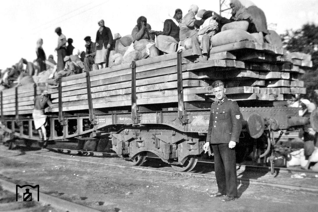 В частности, гражданское население, как и здесь, в Украине, страдало от отсутствия адекватных транспортных средств, поскольку военным был отдан абсолютный приоритет. Еедующим в базарный день приходилось садиться и на груженые брусом вагоны. (1943) Foto: Privatfoto