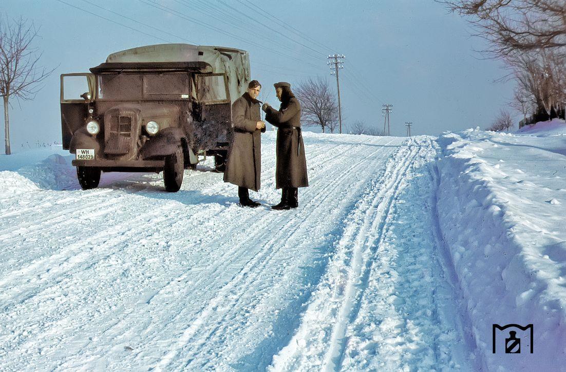 В Хелме, на восточной окраине "Генерал-губернаторства", непосредственно на границе с Украиной, колонна груженых грузовиков, в том числе Büssing NAG Type 4500 A-1, ждет отправки на Восточный фронт. Автомобили уже имеют белую камуфляжную окраску для предстоящей зимы. Хотя эта картина может свидетельствовать об обратном, самое позднее зимой 1941/42 года моторизованный вермахт достиг предела. В военном дневнике одной пехотной дивизии записано: "Современные грузовики с резиновыми шинами и шарикоподшипниками давно уже сломались под тяжестью ужасных дорог и были заменены русскими крестьянскими повозками. Таким образом, наша ежедневная потребность в 170 тоннах продовольствия, боеприпасов и топлива была перевезена преимущественно примерно 5000 лошадьми". (1942) Foto: RVM (Bandelow)