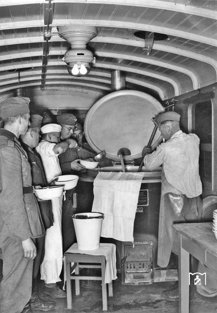 Раздача еды в специальном железнодорожном вагоне-кухне, построенном для использования в поездах для отпускников с передовой, а также для обслуживания небольших войсковых транспортных поездов. (08.1941) Foto: RVM (Steiner)
