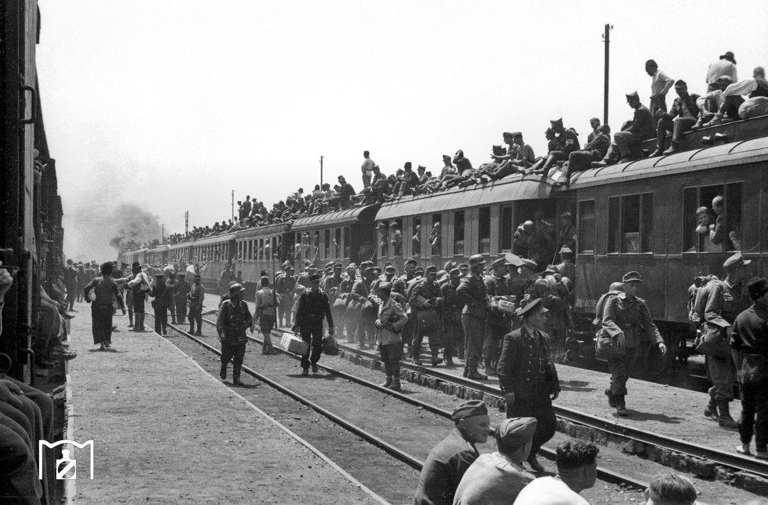 Точное местоположение этой хаотичной сцены на вокзале не сообщается. Она заснята во время Балканской кампании Второй мировой войны, когда немецкий вермахт напал на Югославию и Грецию 6 апреля 1941 года и оккупировал обе страны в течение нескольких недель после того, как нападение итальянского союзника на Грецию закончилось катастрофой. Снимок сделал немецкий солдат из своего поезда. (1941)
