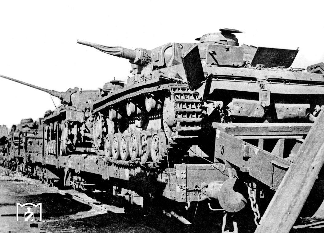 Танк Тип III (спереди) на погрузочной площадке в Украине. Панцеркампфваген III был стандартной моделью во время Второй мировой войны и был оснащен пушкой для борьбы с танками. Разработанный Daimler-Benz танк III, который в 1941 и 1942 годах был основным немецким танком, хорошо проявил себя в первой половине войны, но после, с появлением более мощных танков противника, его боевая ценность быстро снизилась из-за ограниченных возможностей по расширению. С 1936 по 1943 год было выпущено 5700 экземпляров. Здесь засняты поврежденные танки, возвращающиеся на родину. (1942) Foto: RVM (Schultz)