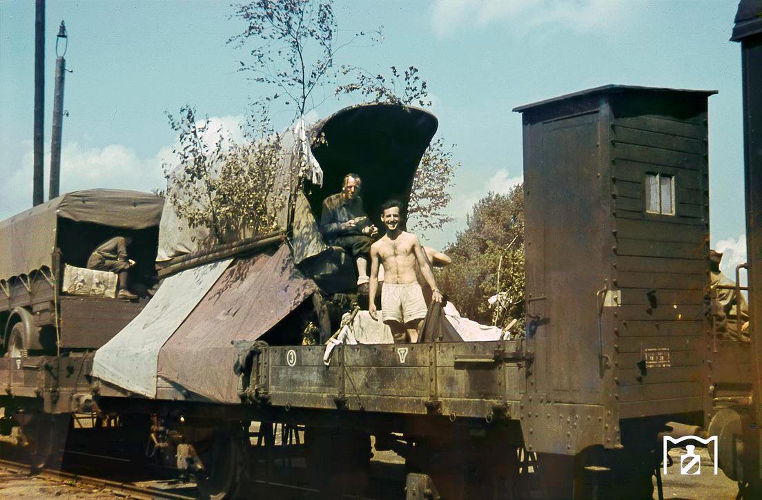 Согласно записям офицера сопровождения, транспортировка четырех танков из Марселя в Нормандию заняла целых 6 дней, так как перевозка осуществлялась "обычными" грузовыми поездами. Снимок остановившегося поезда был сделан в Либурне, к востоку от Бордо. Как отметил автор, скот, пасущийся на маршруте, не служил пищей. (03.1944) Foto: Friedrich Nusser