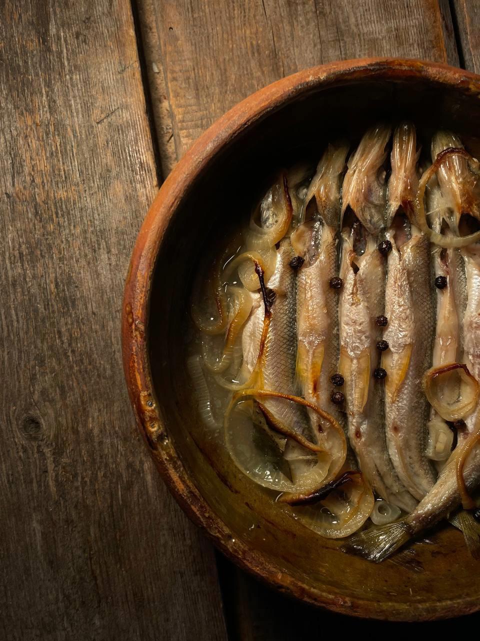 Рыба сначала панируется в муке и обжаривается, а затем томится в рыбном бульоне с картофелем и луком в русской печи. За счет муки бульон сгущается, и в него потом так вкусно обмакивать куски хлеба.