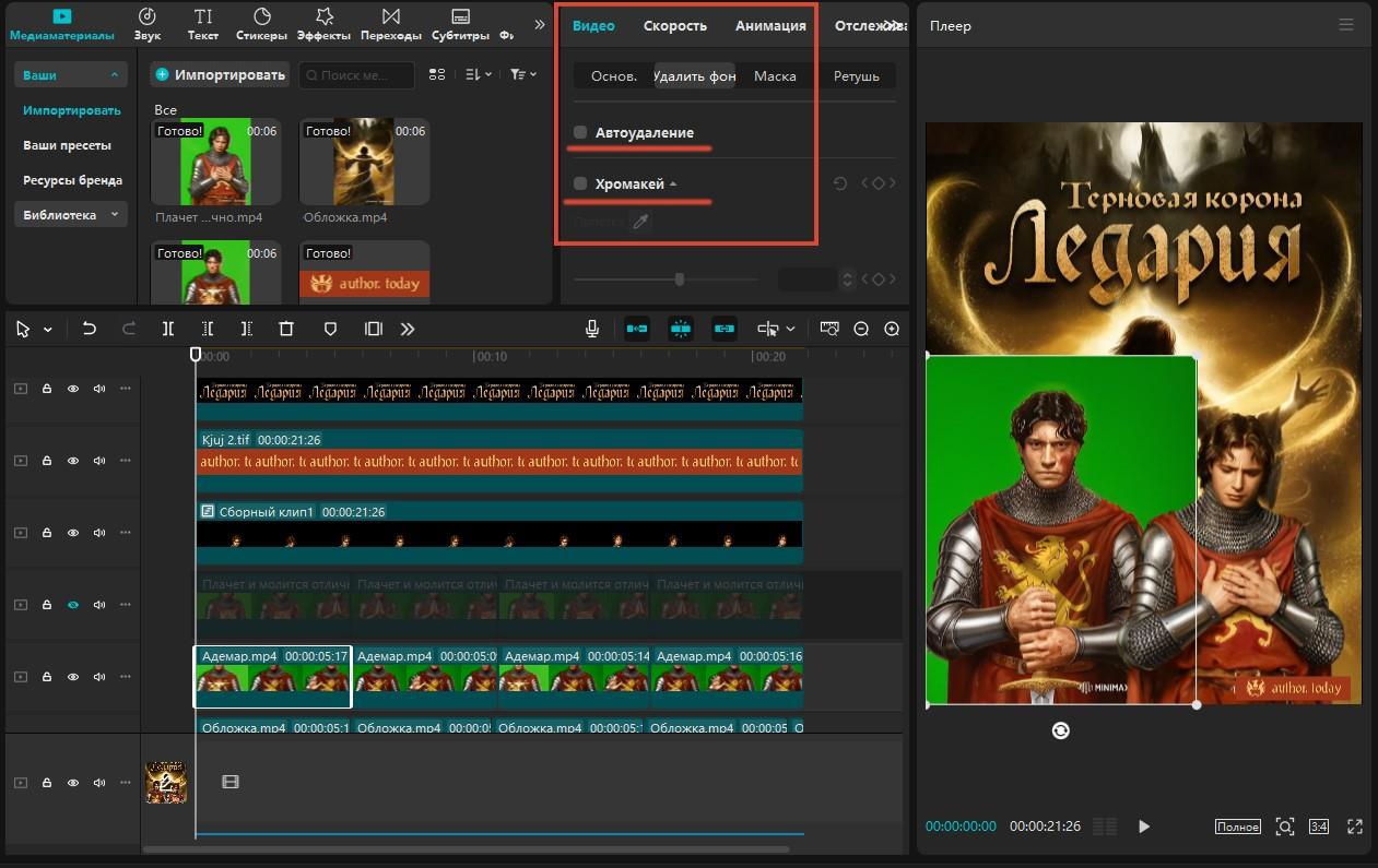 В левое верхнее окошко для медиаматериалов перетаскиваем мышкой из папок наши ролики, название книги на прозрачном фоне, баннеры и все, что требуется для обложки. Затем уже оттуда перетаскиваем все это в нижнее окно на разные дорожки. И если мы выделим какой-нибудь один ролик, то наверху появится окошко редактирования видео.