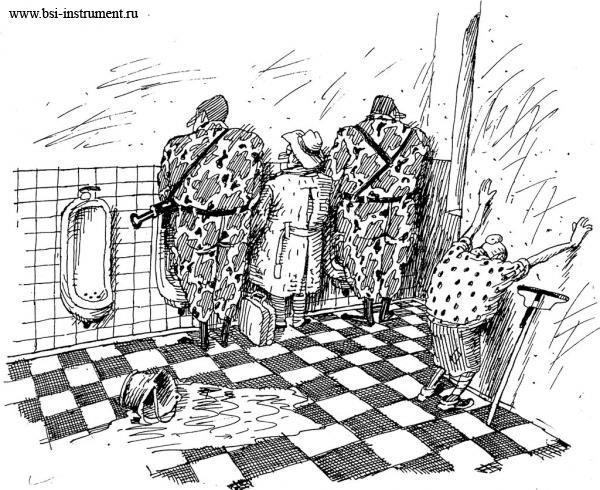 Но О"Салливан, попросил диктатора чуток погодить, и подал знак своей команде. Пять теней мелькнули в дверях, внутри "Помещения для раздумий" послышался шум и оттуда вывели двух туалетных работников с заломленными за спину руками. Старший новой смены, гордо продемонстрировал складной нож, еще не наваху, но уже и не перочинный. Зайдя в туалет, диктатор увидел стоящую лицом к стене уборщицу с поднятыми руками и стерегущего каждое ее движение охранника. Диктатор проникся и нашел соломоново решение...