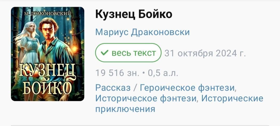Первое место: Мариус Драконовски – «Кузнец Бойко». (Ссылка - https://author.today/work/390913).