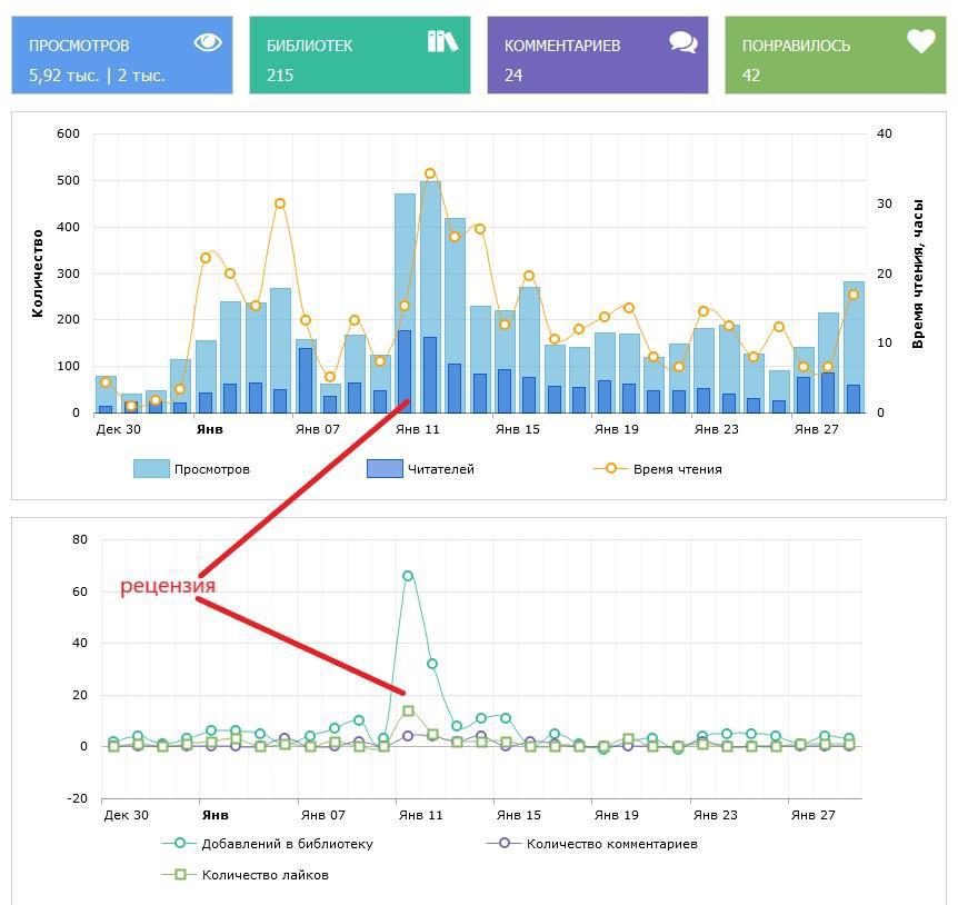 Да, помимо прочего, роман попал в подборку «Юмористическая фантастика и фэнтези», и часть читателей пришло из неё, но тем не менее скачок показателей именно после рецензии довольно заметен. Для попадания в какой-либо топ или хотя бы выполнения требований КС маловато, но инструмент продвижения явно рабочий.