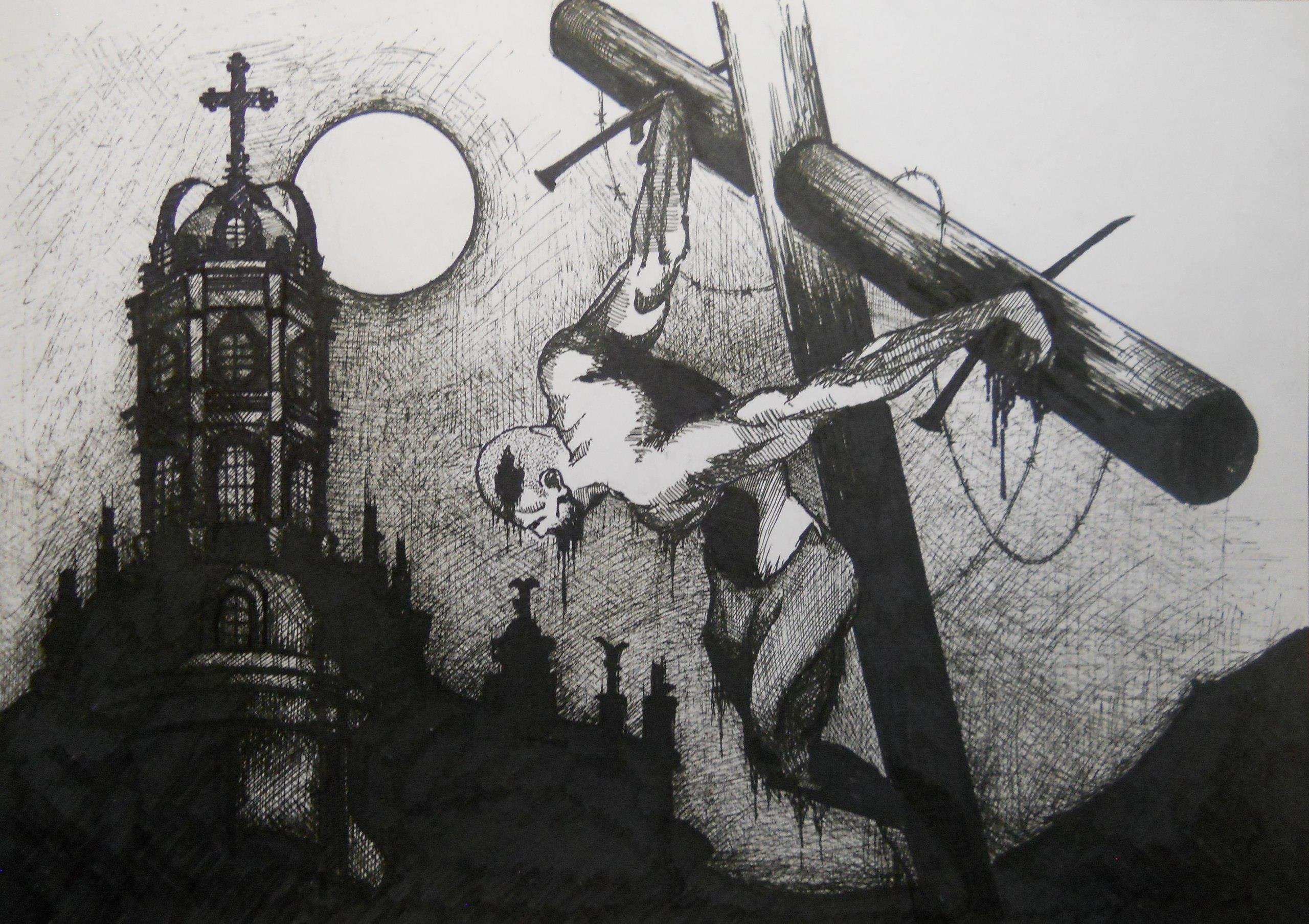 Невольно дергаю руками, позабыв, что запястья прибиты гвоздями к деревянной балке. Распятый на кресте, я вишу над землей. Боль сводит меня с ума. С трудом разлепляю заплывшие от кровоподтеков веки. Смотрю вниз.