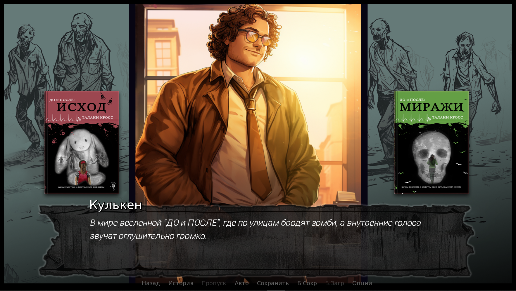 То есть в визуальные новеллы я до этого никогда не играл и не особо планировал, но тут Талани Кросс начала делать такую игру по своей дилогии "До и После" (пока дилогии - в своей группе для донов она публиковала новые главы из третьей книге). А мне обычно интересно, чего там мои друзья творят