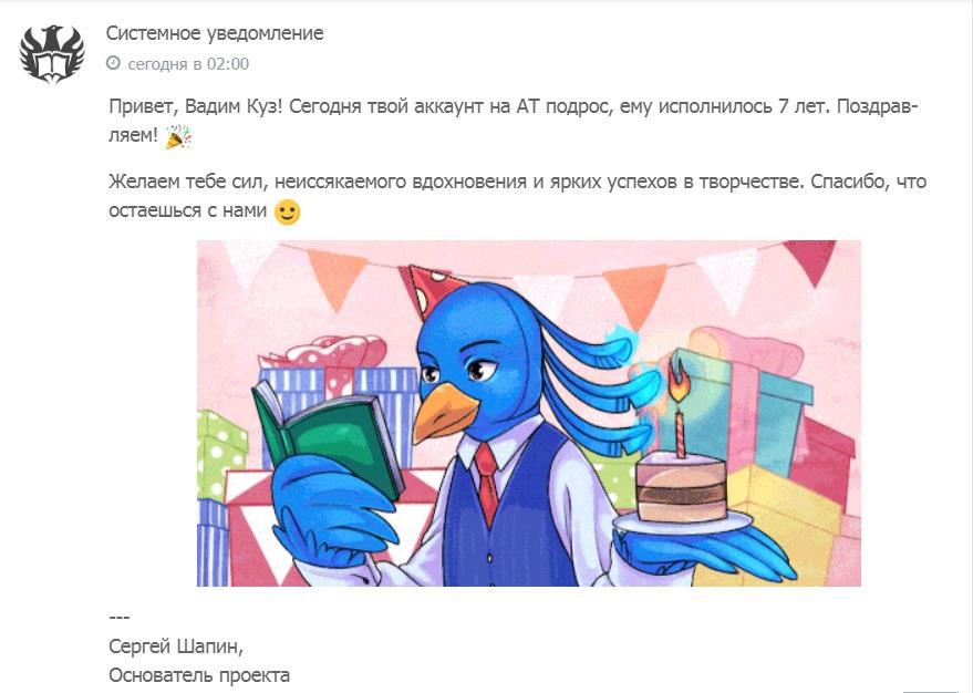 Автор: Вадим КузВо первых сайт АТ поздравил меня с семилетним прибыванием на этом ресурсе. Хотя этот аккаунт не первый, который я снёс. Он был бы постарше.) Очень приятно!