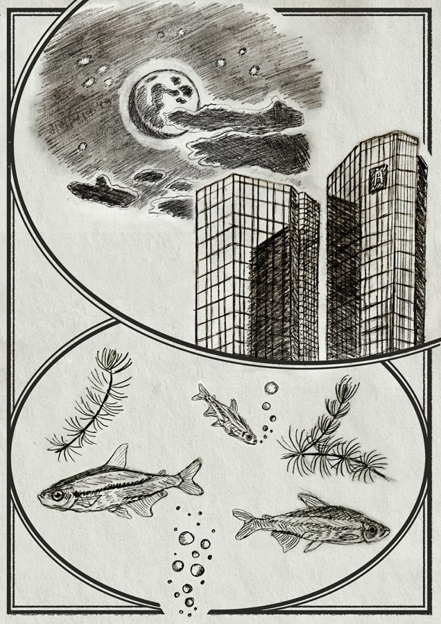 Моделью для небоскрёбов на рисунке послужило фото башен во Франкфурте (от друга), для описания в тексте - совсем другие здания.