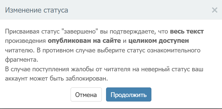 И когда хотел указать его завершенным, неожиданно столкнулся с этой плашкой. И я прям испугался - "дядь АТ, не бань пожалуйста, я просто новичок писатель, который хочет запостить рассказ." Вдруг придут какие-то читатели и скажут "Рассказ не полный, его можно дописать" и меня за это забанят.