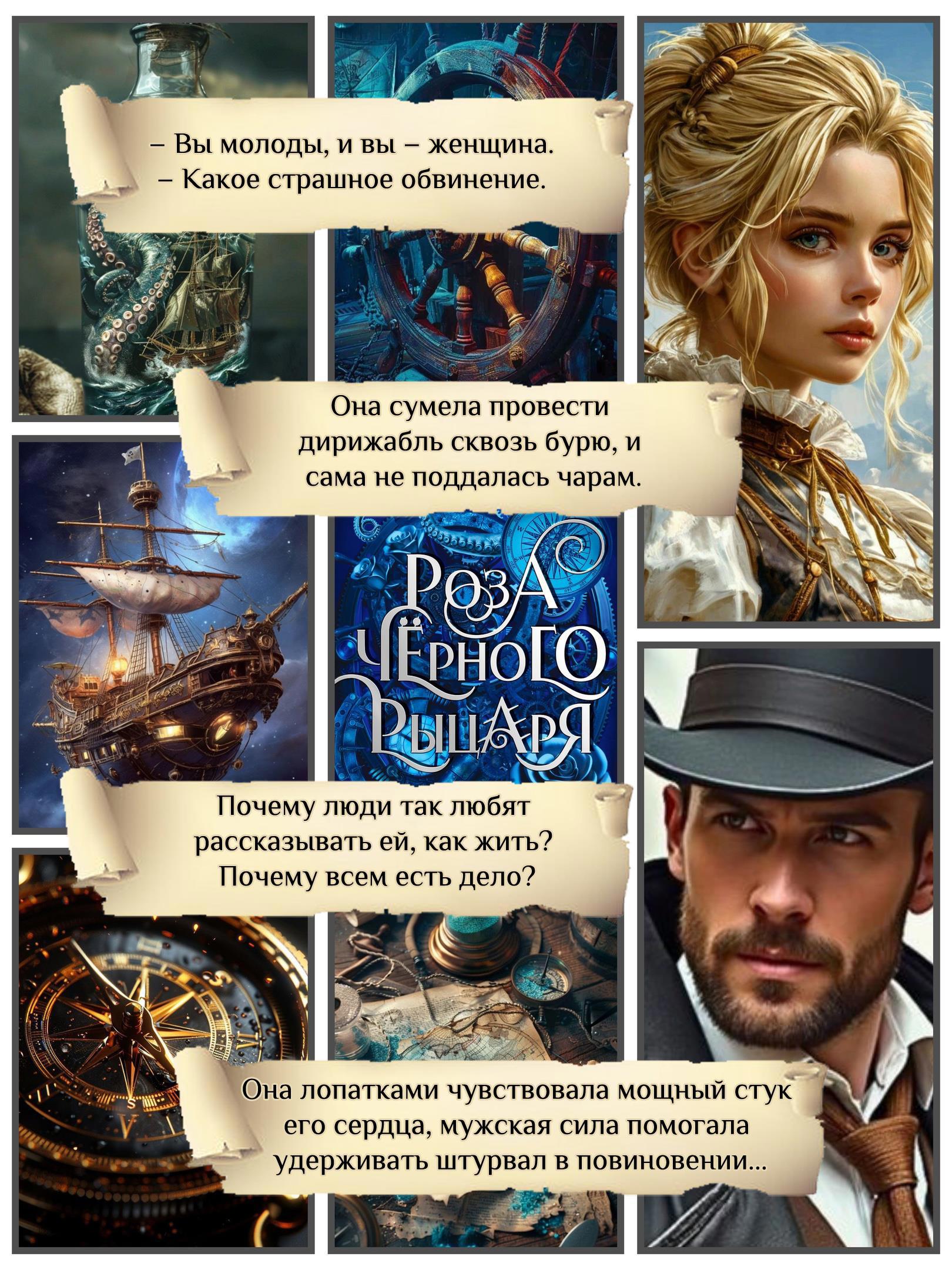 Автор: Мария КамардинаЕщё пара эстетика с цитатами. Первая по мотивам романа «Роза чёрного рыцаря», вполне в духе книги – и героиня Шедевруму удалась, и штурвал-компас-карта для атмосферы путешествия, и щупальца кракена есть, и летучий корабль – хотя у нас по сюжету дирижабль, и на мачтах у него баллон, паруса только для манёвра.