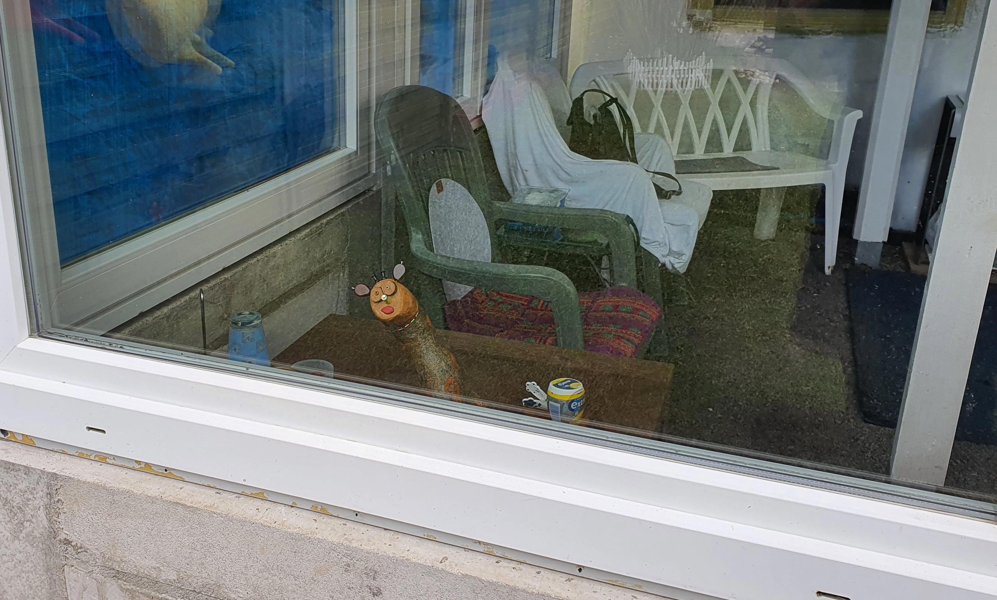 ...переехала в сад, охранять. Выглядит на фото не очень, но в реальности ржачно смотрится.